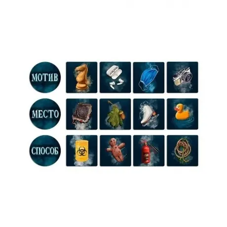 14 карт ролей, 1 2 карт персонажей, 150 карт улик, 3 жетона категорий, правила игры