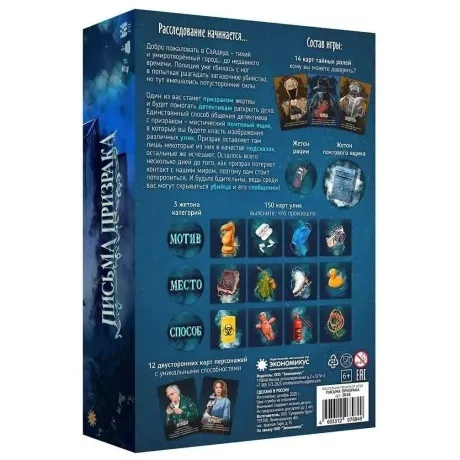 Настольная игра Экономикус Письма Призрака ЭО48 позволит весело провести время в компании или в семейном кругу. Письма Призрака – детективная настольная игра с тайными ролями. В маленьком городке происходит что-то загадочное. Полиция уже сбилась с ног в попытках разгадать очередное преступление. К счастью, юная амбициозная журналистка рядом с домом жертвы совершенно случайно обнаружила мистический почтовый ящик. В это трудно поверить, но что-то происходит с фотографиями улик, брошенными в этот ящик. Часть из них исчезают бесследно, а часть возвращаются – будто некий призрак пытается что-то рассказать вам. Вы просто пришли поддержать вашу подругу в её журналистском расследовании. А оказались вовлечены в расследование сами, как настоящие детективы. Впрочем, возможно кто-то из вас оказался здесь совсем не случайно – убийца может скрываться среди ваших друзей! “Письма Призрака” – игра с тайными ролями о расследовании преступления. Игроки-детективы из 12 улик (изображений предметов), обнаруженных на месте преступления, вычисляют 3 истинные улики. Детективам помогает Игрок-Призрак (жертва преступления) с помощью других улик-подсказок, ассоциативно намекая на истинные улики. Среди Детективов прячется Убийца, который стремится запутать расследование. Игра длится 4 раунда: – игроки выбирают из руки и передают взакрытую по 1 улике Призраку, – Призрак открывает из них удачные. А неподходящие оставляет закрытыми. Игрок с тайной ролью Убийцы стремится запутать следствие – как в обсуждении открытых улик, так и путём блефа об уликах, оставленных закрытыми. После 4-х раундов игроки большинством голосуют за 3 улики и игрока-Убийцу. Чем больше игроков, тем больше интересных ролей: Сообщники Убийцы, Свидетель, Эксперт, Шантажист. В расширенном режиме в игру добавляются карты персонажей с уникальными способностями.