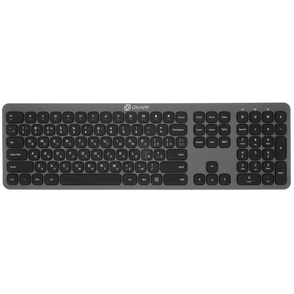 Представляем вашу вниманию беспроводную клавиатуру Oklick, сочетающую в себе комфорт и стиль. Эта полноразмерная клавиатура, выполненная в элегантных серых и черных тонах, идеально подходит для использования с персональными компьютерами.