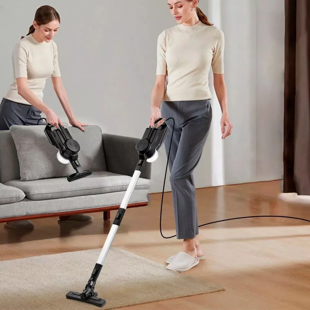 Вертикальный пылесос КТ-5143 удобен при локальной и генеральной уборке. Он компактен, всегда под рукой и готов к работе. Утомительный процесс превращается в лёгкое и увлекательное занятие, а время уборки сокращается вдвое! При отсоединении удлинительной трубки вертикальный пылесос КТ-5143 превращается в ручной пылесос. Это идеальный помощник для уборки в труднодоступных местах, для чистки мягкой мебели и многого другого. Пылесос укомплектован двумя пылесборниками для более качественной уборки. В комплекте идёт дополнительный пылесборник с фильтром грубой очистки, который позволит задержать весь основной мусор ещё перед многоуровневой фильтрацией в основном пылесборнике. В комплекте к вертикальному пылесосу идёт набор из насадок для совершенно разных случаев уборки: щётка с микрофиброй, узкая насадка, широкая ворсовая щётка и насадка «2 в 1». Благодаря такому разнообразию вы сможете выбрать идеально подходящую насадку! Напольная щётка вращается в двух плоскостях и имеет две сменные насадки: с ворсом и микрофиброй, для более качественной уборки ковровых покрытий. Они помогут собрать волосы и шерсть животных, которые трудно удалить одним лишь потоком всасываемого воздуха. Насадкой «2 в 1» можно убирать поверхности, для которых широкая ворсовая щётка слишком большая. Насадка разборная: нажмите на кнопку и потяните верхнюю часть в сторону. Ворсовая часть насадки отсоединится, и насадку можно будет использовать без ворса. Кнопка включения располагается на рукоятке пылесоса и позволяет удобно и быстро включить и выключить прибор прямо в процессе уборки. Пылесборники оборудованы современным циклонным фильтром. Для основного пылесборника предусмотрены фильтр грубой очистки, поролоновый и тканевый фильтры, которые можно вынуть и почистить. Пылесборник также легко откручивается от корпуса и очищается!