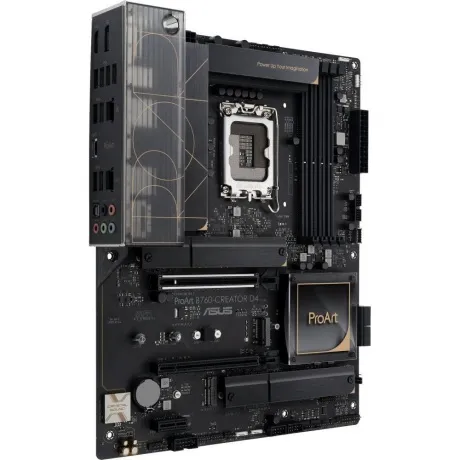 Оснащенная высокопроизводительным чипсетом Intel B760 материнская плата ASUS ProArt B760-CREATOR D4 станет отличным выбором для пользователей, которые хотят создать мощный универсальный компьютер, в том числе – предназначенный для графического дизайна. Модель совместима с процессорами Intel Alder Lake и Raptor Lake. Сокет для CPU – LGA 1700. Максимально допустимый объем оперативной памяти составляет 128 ГБ. Плата рассчитана на установку модулей DDR4, количество которых может достигать четырех. 2 слота PCI-E x16 и 1 слот PCI-E x1 наверняка будут достаточны для размещения всех необходимых плат расширения. 3 разъема M.2 совместимы с высокоскоростными твердотельными накопителями. В числе преимуществ платы ASUS ProArt B760-CREATOR D4 – высококачественный звук Crystal Sound 3 и 2.5-гигабитный сетевой адаптер. 2 разъема M.2, зона VRM и чипсет располагают пассивным охлаждением.