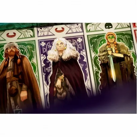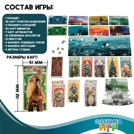 1 планшет, 35 карт пунктов назначения (20 торговых земель, 15 влиятельных мест), 4 корабля (белый, бежевый, коричневый, черный) 50 карт викингов, 7 карт артефактов (дополнительный режим игры), 12 серебряных браслетов, 12 рекрутов, 4 маркера победных очков, 4 маркера репутации, 4 жетона судьбы