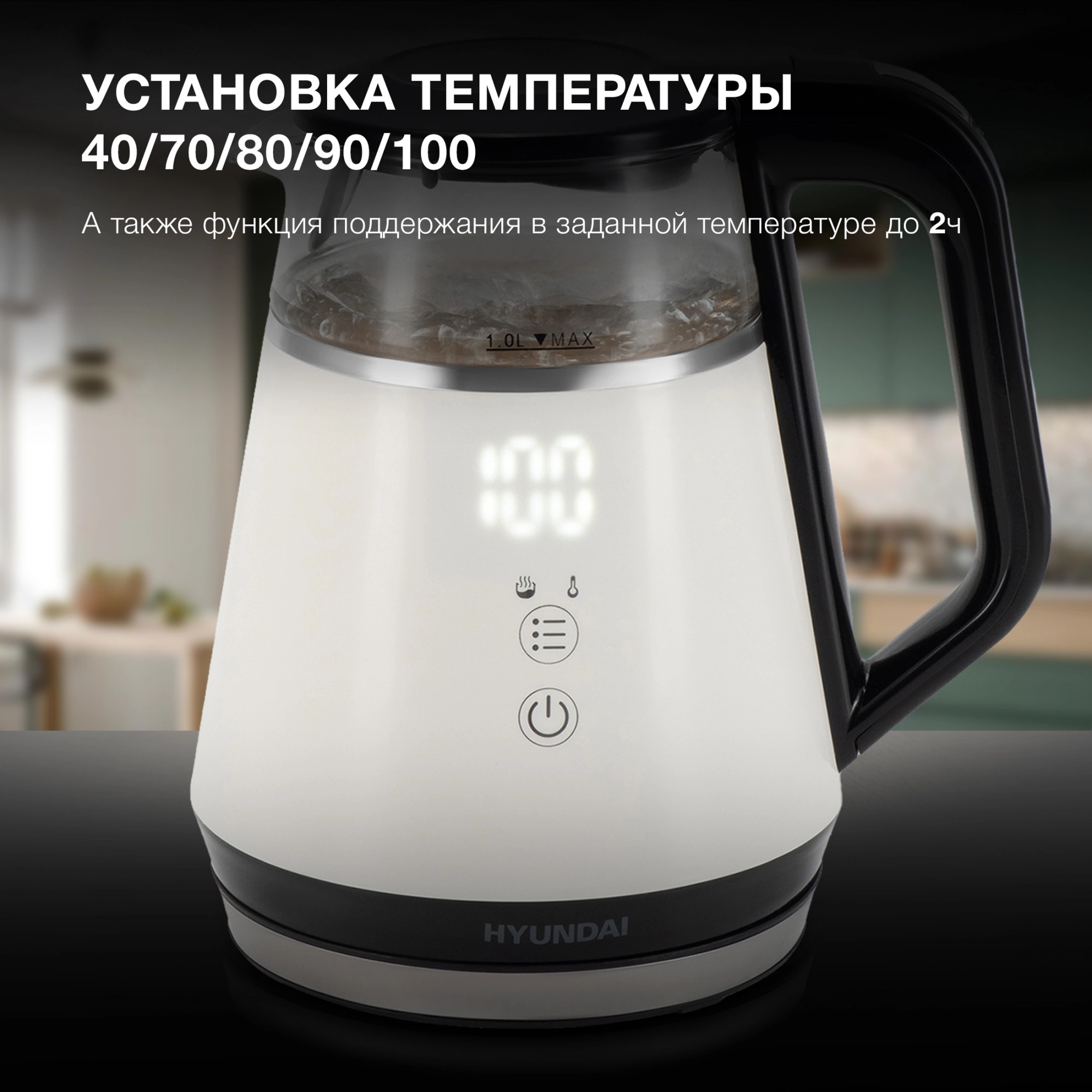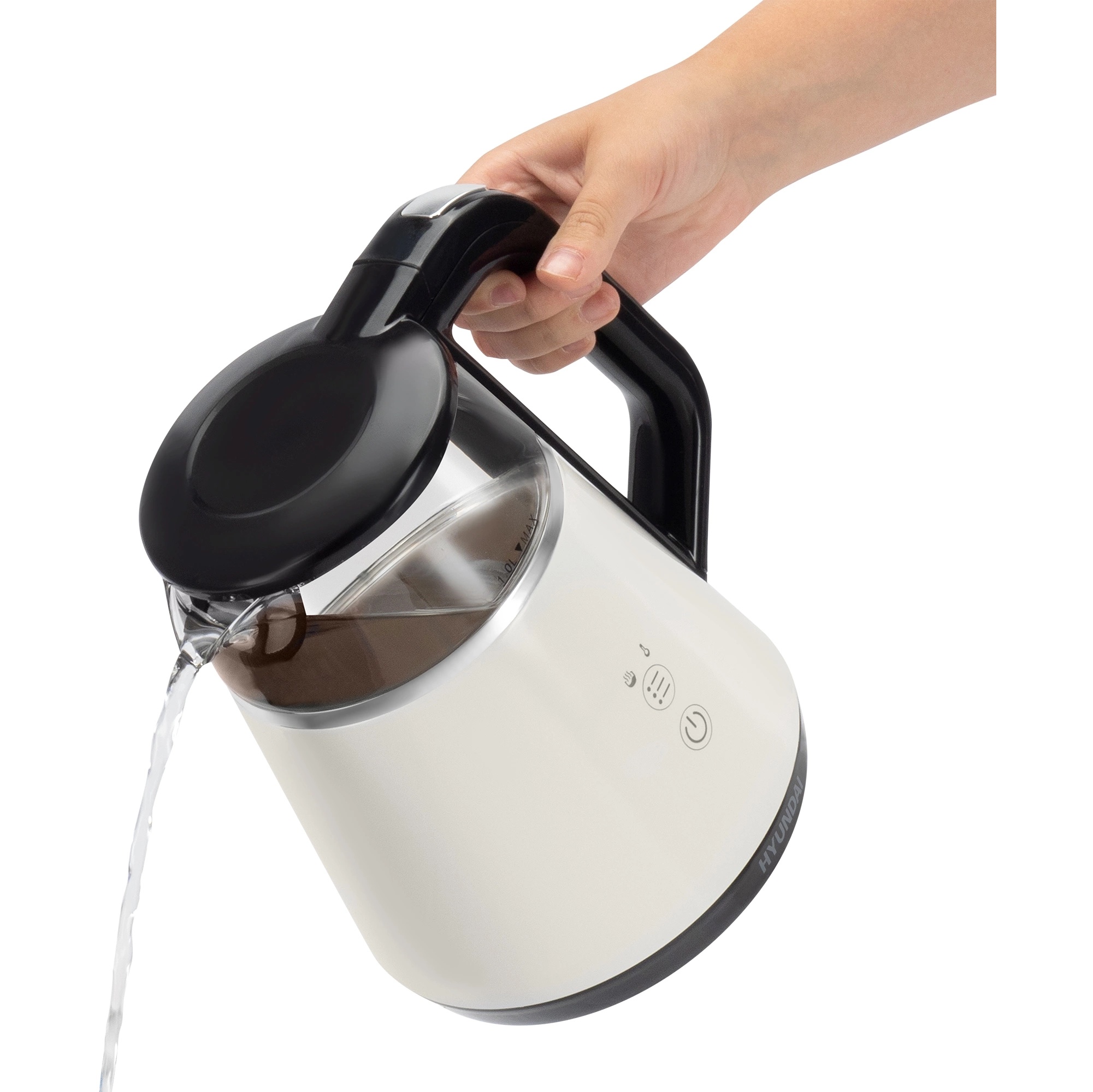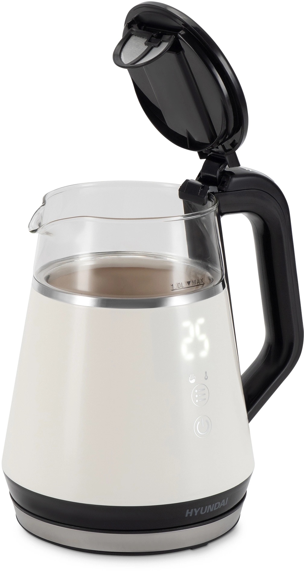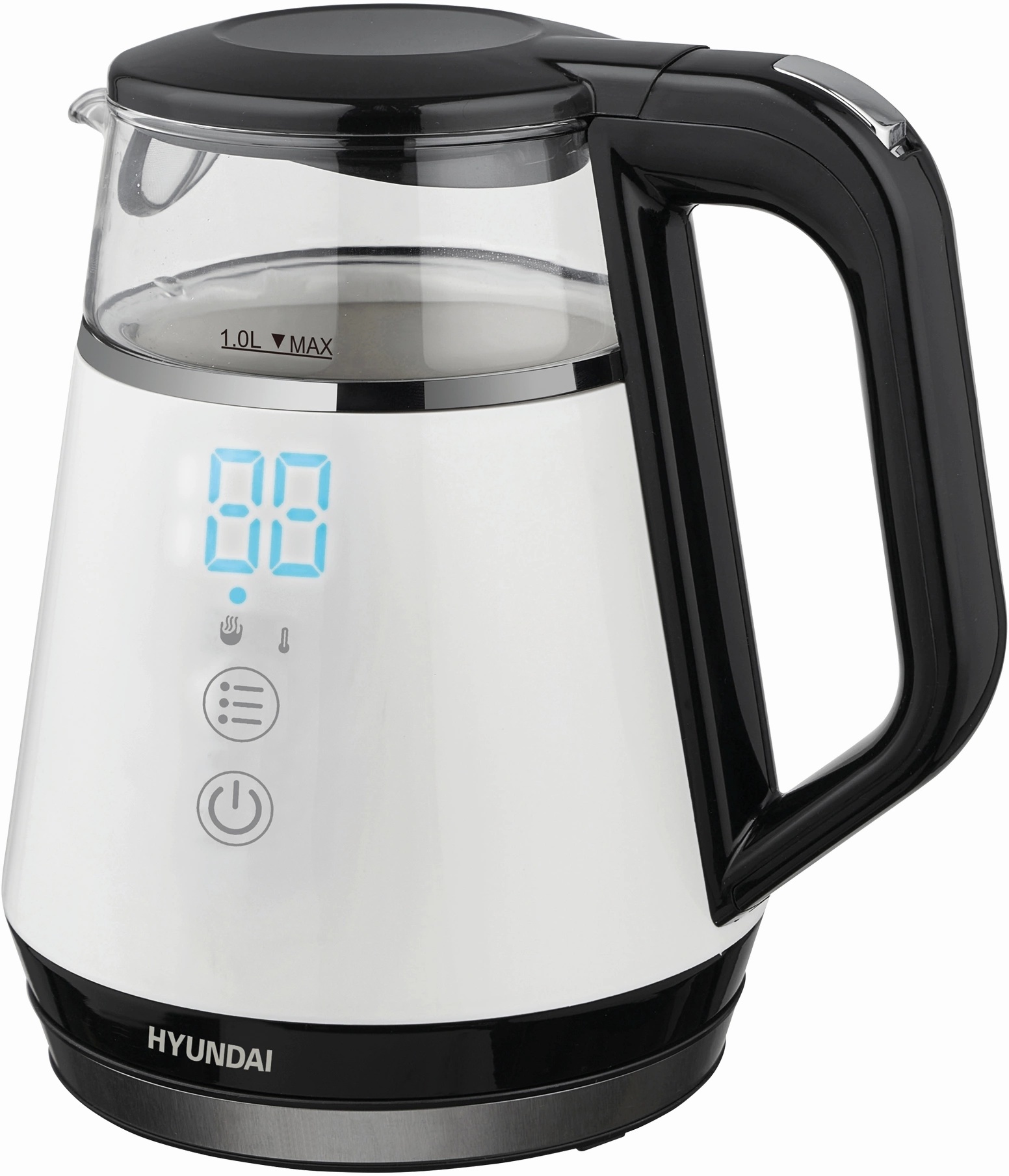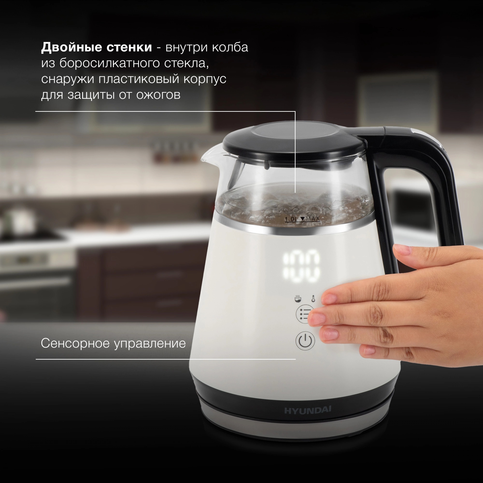 Электрический чайник Hyundai HYK-G3013 в стильном сочетании белого и черного с прозрачным стеклянным корпусом – современное устройство, которое сочетает в себе элегантный дизайн, передовые технологии и заботу о Вашей безопасности. Мощность в 1100 Вт обеспечивает быстрый, но при этом экономичный нагрев воды, а компактный объем в 1.0 литра идеально подходит для приготовления напитков для 1-2 человек. Особенностью этой модели является двойной теплоизолированный корпус. Внешняя часть из термостойкого пластика защищает от ожогов при случайном прикосновении, а внутренний корпус из боросиликатного стекла не только позволяет наблюдать за процессом закипания, но и гарантирует, что вода не будет впитывать запахи и не приобретет посторонний привкус. Боросиликатное стекло устойчиво к высоким температурам, не темнеет и не окрашивается со временем. Hyundai HYK-G3013 предлагает 5 настраиваемых температурных режимов (45, 55, 65, 85 и 100 градусов Цельсия), а также функцию поддержания температуры. Наличие дисплея делает управление чайником интуитивно понятным и простым. Скрытый нагревательный элемент обеспечивает быстрый и равномерный нагрев. Благодаря наличию фильтра от накипи вода остается чистой и напитки не приобретают посторонних привкусов. Автоматическое отключение и защита от включения без воды гарантируют безопасность использования. Звуковой сигнал оповещает о закипании. Подставка с вращением на 360 градусов и удобная кнопка открытия крышки делают использование удобным.