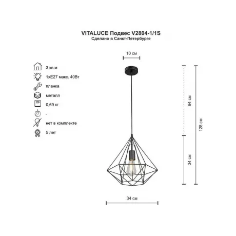 подвесной светильник vitaluce v2804-1/1s с одной лампой e27 мощностью до 40 вт, металлический корпус черного цвета, высота 128 см, подходит для создания современного интерьера