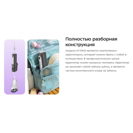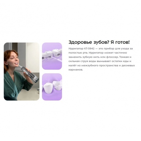 Ирригатор КТ-5942 — это прибор для ухода за полостью рта. Ирригатор может частично заменить зубную нить или флоссер. Тонкая и сильная струя воды вымывает остатки еды и налёт из межзубного пространства и десневых карманов.