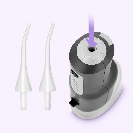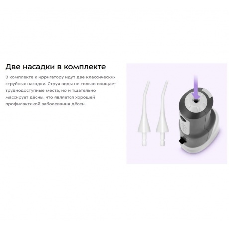 ирригатор с заглушкой разъема для зарядки и всасывающей трубкой с фильтром, резервуар для воды с уплотнительным кольцом крышки резервуара, струйная насадка — 2 шт., USB шнур, руководство по эксплуатации, упаковка