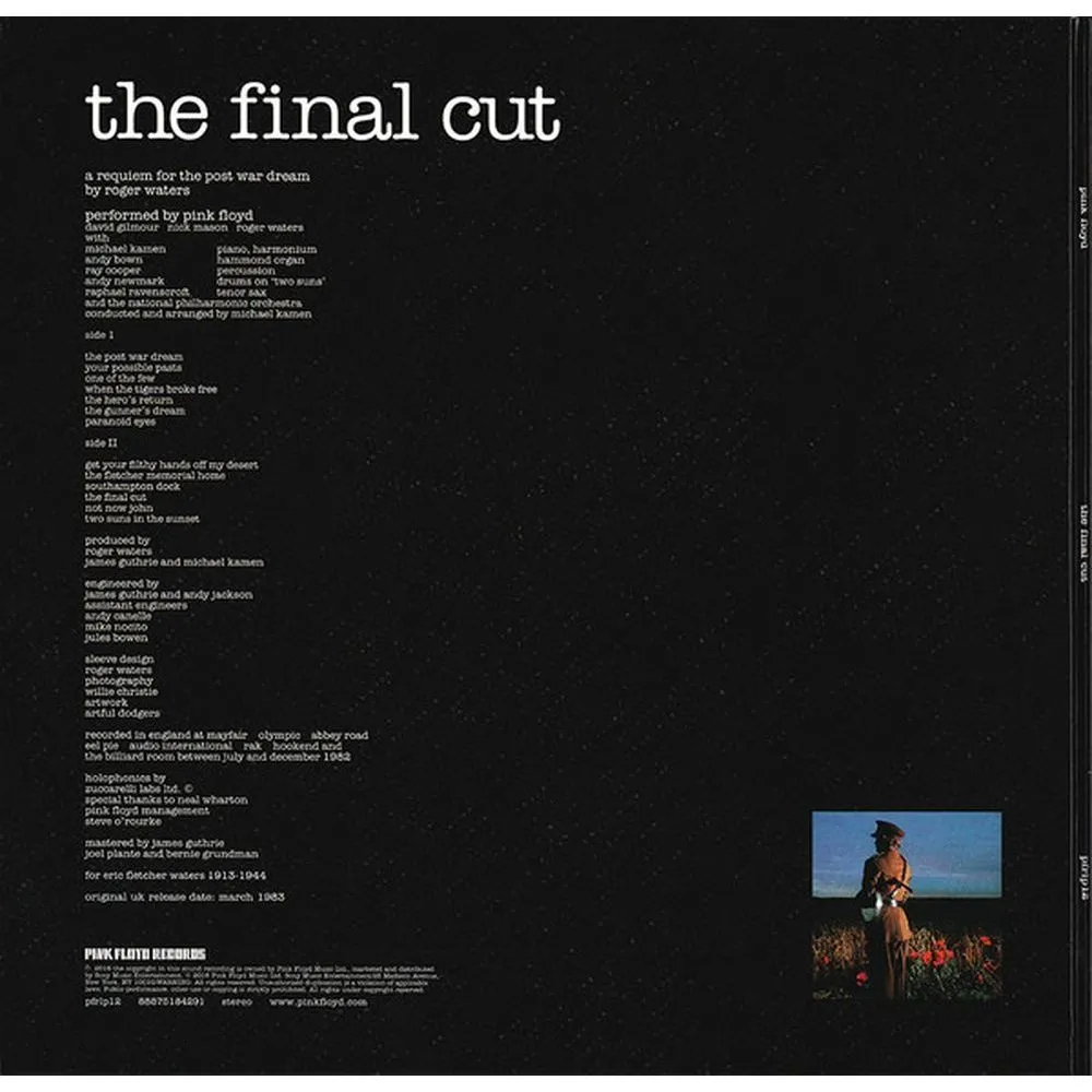 «The Final Cut» — двенадцатый студийный альбом британской рок-группы Pink Floyd, выпущенный 21 марта 1983 года на лейбле Harvest компании EMI Records Ltd. Это последний альбом Pink Floyd, в записи которого участвовал Роджер Уотерс. Альбом посвящён отцу Роджера Уотерса — Эрику Флетчеру Уотерсу, погибшему во второй мировой войне. В буклете к альбому написано: «Реквием по послевоенной мечте, написанный Роджером Уотерсом, исполненный группой Пинк Флойд. Для Эрика Флетчера Уотерса 1913?1944». Как написал Энди Маббет: "Фактически во всём, кроме названия, это было творение Роджера Уотерса". Автором всех песен является Уотерс. Альбом достиг первого места в хит-парадах Великобритании и шестого в США. Первоначально планировалось, что «The Final Cut» станет саундтреком фильма «The Wall», но он вышел как антивоенный альбом Роджера Уотерса. Из-за конфликтов между Уотерсом и Ричардом Райтом, начавшихся ещё при работе над альбомом «The Wall», альбом «The Final Cut» стал единственным, в записи которого Райт не принимал участия.