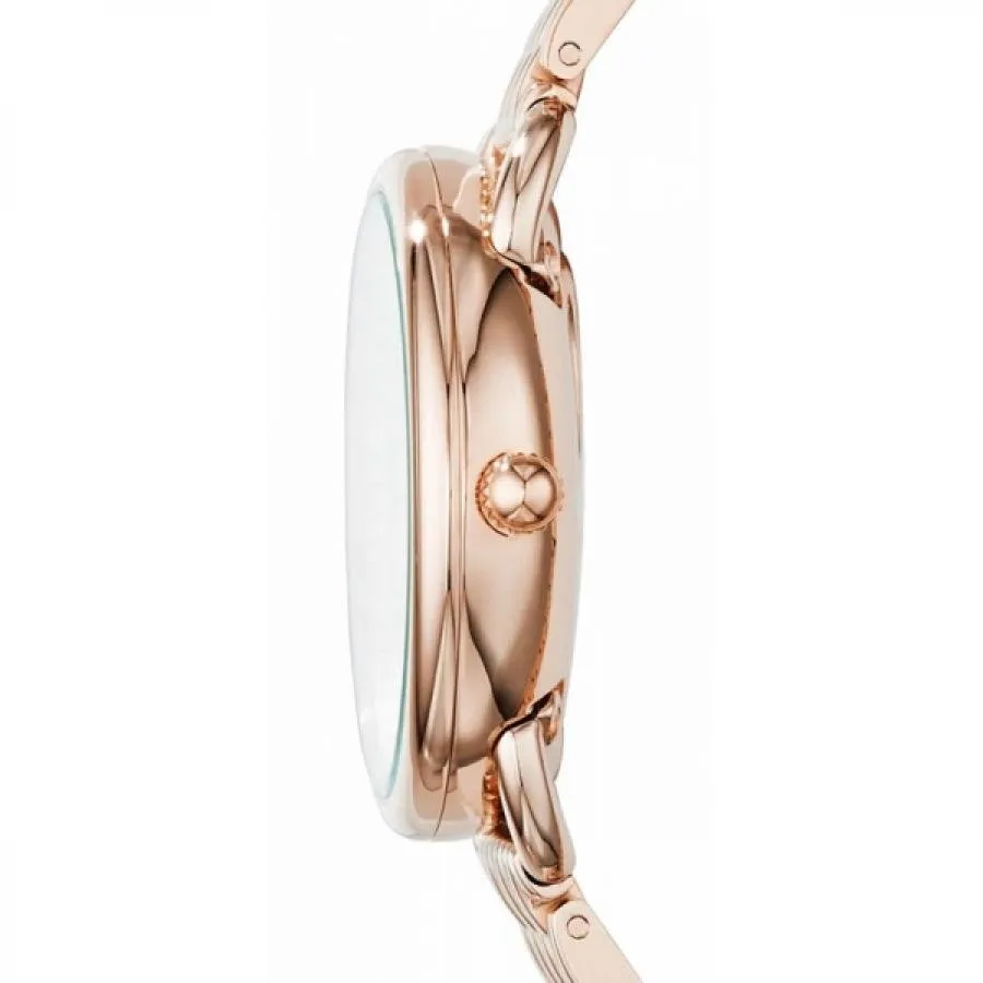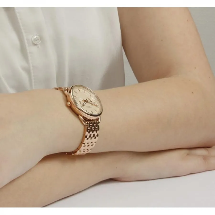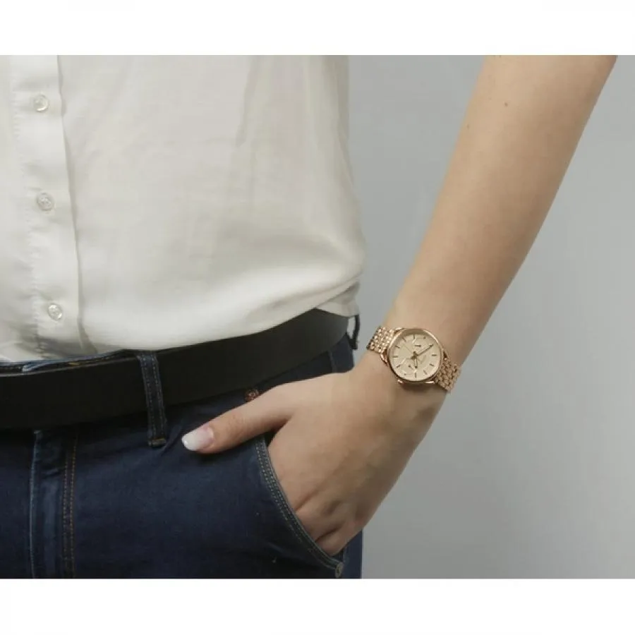 Кварцевые часы. 12 часовой формат времени. Индикатор числа и дня недели. Люминесцентные стрелки. Корпус и браслет из нержавеющей стали с розовым PVD покрытием. Минеральное стекло. Диаметр 35 мм.