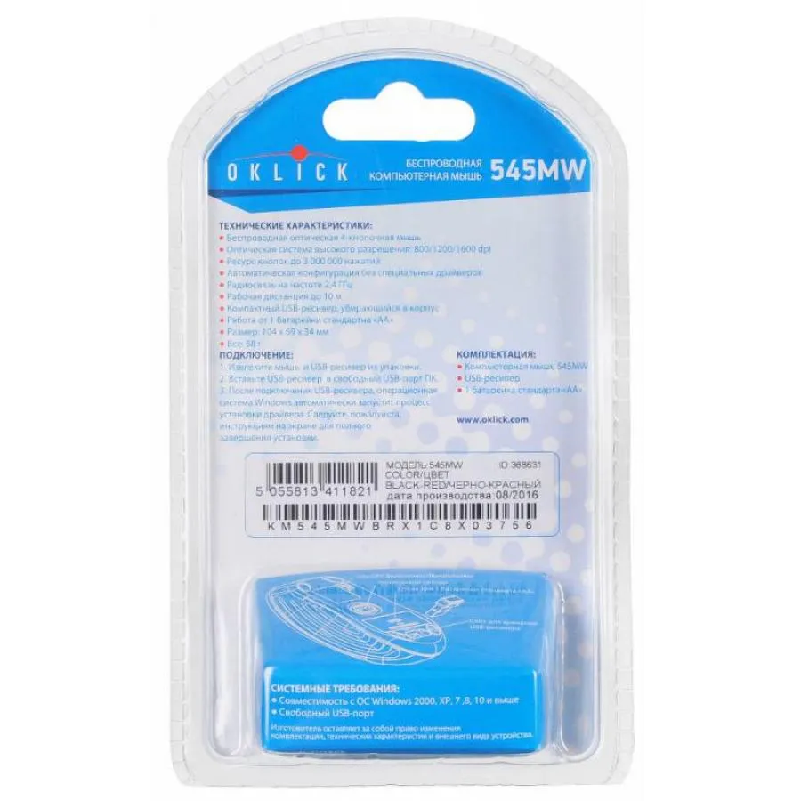 Мышь беспроводная Oklick 545MW подойдет для подключения к стационарным и мобильным компьютерам. Радиус действия беспроводной связи составляет 10 м: мышь будет удобно использовать везде: дома, на отдыхе или на работе. Манипулятор изготовлен из матового пластика. В верхней части корпуса мыши расположена кнопка, используемая для переключения режимов работы оптического датчика. Мышь может работать в 3 режимах: 800, 1200, 1600 dpi.Корпус мыши имеет симметричную форму. Благодаря этой особенности модель подходит как левшам, так и правшам. Для подключения приемника беспроводного сигнала используется порт USB. Беспроводной ресивер крайне компактен: его использование не доставит вам неудобств даже в случае, если вы эксплуатируете ультрабук.Для питания мыши Oklick 545MW используется батарейка широко распространенного типа AA. Допускается использование аккумуляторов этого же форм-фактора. Мышь очень надежна: ресурс ее кнопок составляет 3000000 нажатий. Габаритные размеры манипулятора составляют 69x34x104 мм. Масса мыши равна 58 г.