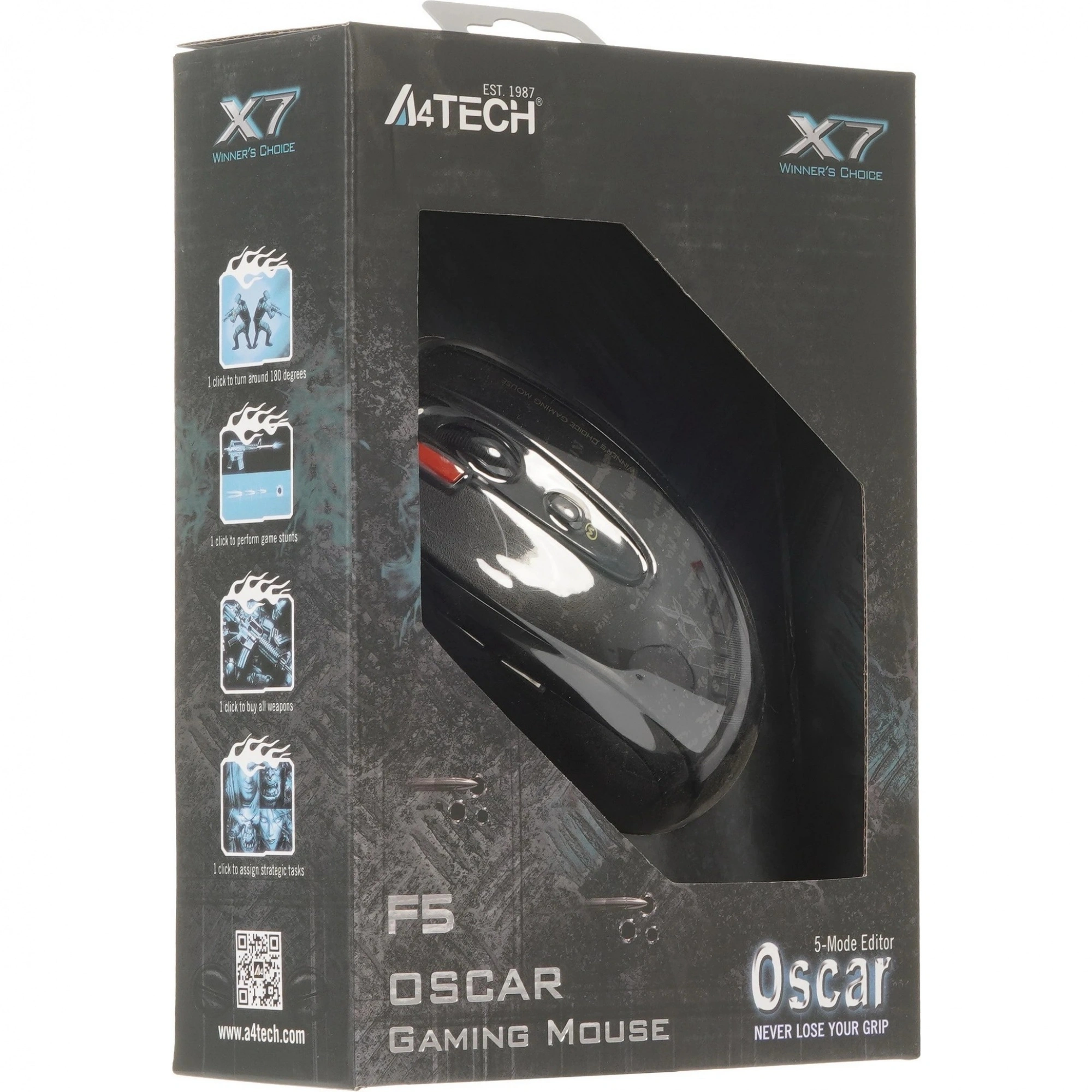 Игровая мышка A4Tech V-Track F5 – отличный выбор для геймера, планирующего не просто получать удовольствие от игры, но и одерживать победы. Она имеет встроенную память объемом 160 Кб, благодаря чему ее можно запрограммировать выполнять действия в игре одним кликом. Редактор скриптов Oscar, представленный на диске, входящем в комплект поставки, позволяет настроить каждую кнопку мыши таким образом, чтобы она выполняла любую команду, которая раньше подавалась с клавиатуры (как одной клавишей, так и целой комбинацией).