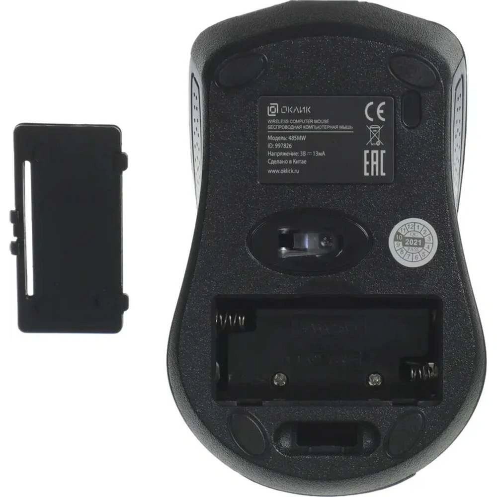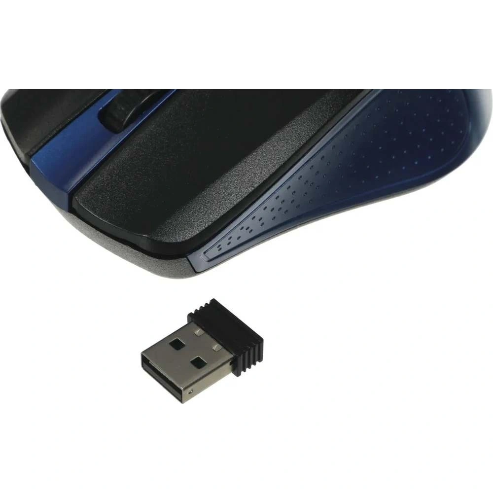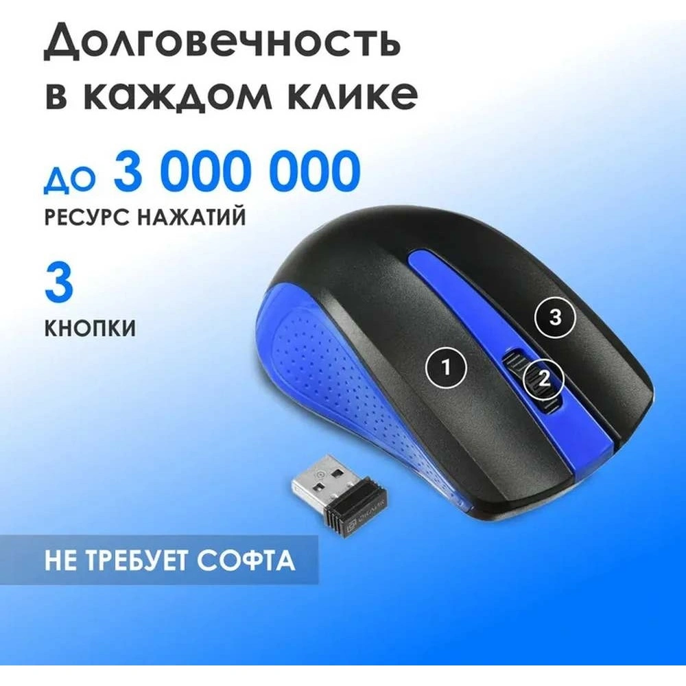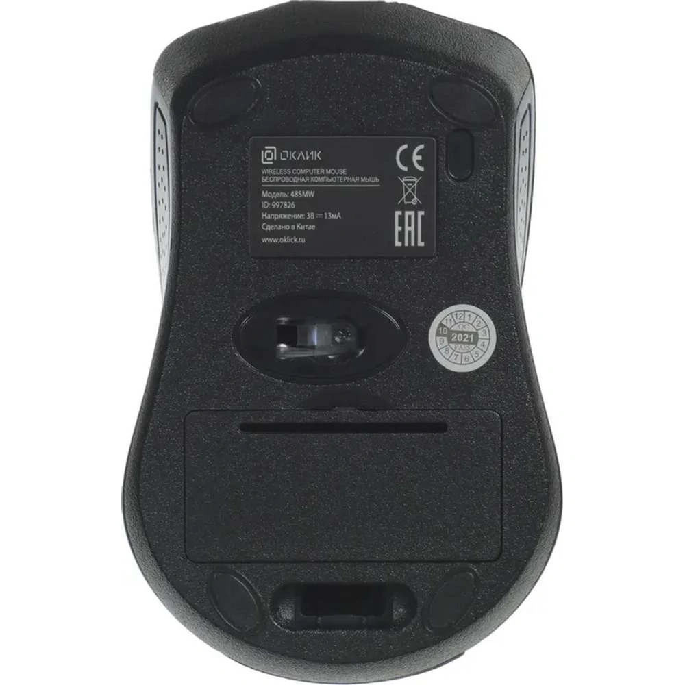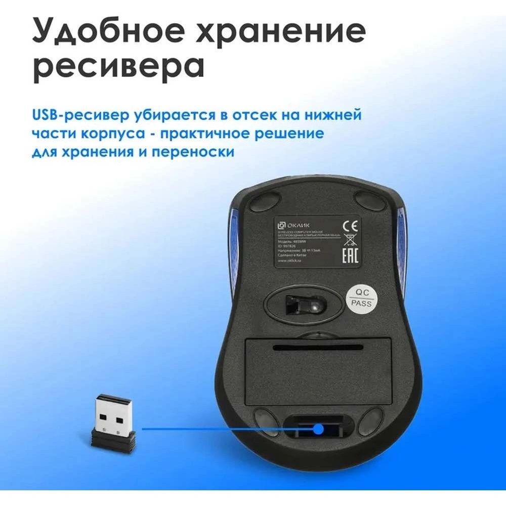 Мышь OKLICK 485MW Black/Blue — простая в управлении полноразмерная модель. Она снабжена двумя клавишами и колесом прокрутки, посредством которых пользователь выполняет необходимые манипуляции. Сенсорный датчик с разрешением 1200 dpi отвечает за быстрый и точный отклик на команды в процессе работы на поверхностях разного типа. Симметричная конфигурация позволяет комфортно пользоваться устройством обеими руками.Подключение к ноутбуку или компьютеру осуществляется посредством радиоприемника с интерфейсом USB. Внешний модуль имеет компактный размер, однако обеспечивает устойчивое сопряжение в радиусе до 10 м. Источником электропитания мыши OKLICK 485MW Black/Blue является батарейка стандарта ААА, которая размещается в специальном отделении нижней панели.