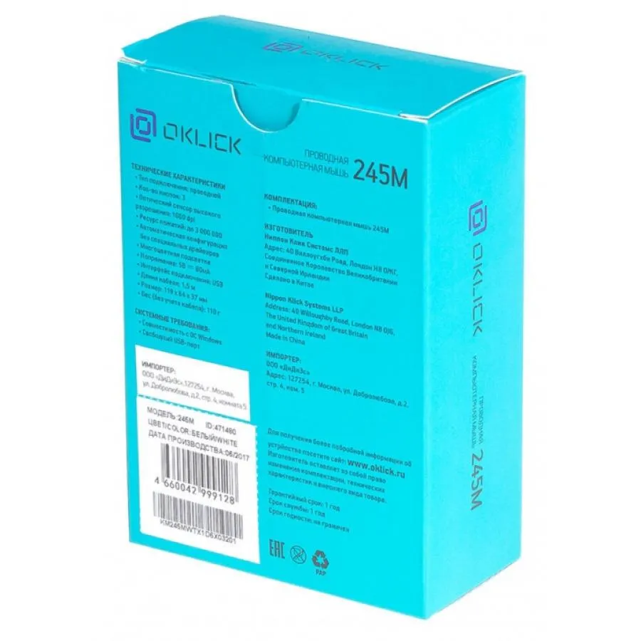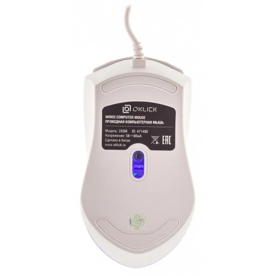 Мышь проводная Oklick 245M – универсальная модель. Устройство можно использовать для игр, работы, повседневного применения. Мышь удобна и позволит полноценно управлять ПК.Изготовлена модель в белом цвете. Для производства ее корпуса применяется матовый пластик, он обладает приятной текстурой поверхности. Присутствует разноцветная подсветка, дополняющая дизайн.Мышь Oklick 245M оснащается оптическим светодиодным сенсором. Он обладает разрешением 1000 dpi, отлично считывает перемещения. Общее количество кнопок – три, они имеют четкое нажатие.Модель универсальная, она подходит для применения правой или левой рукой. Мышь получила стандартные габариты, масса изделия составляет 110 г. Подключение происходит посредством порта USB, питание для работы поступает по шине. Длина провода 1.5 м. Можно легко выполнить соединение, кабель не будет ограничивать перемещения манипулятора.Мышь прослужит вам в течение продолжительного времени. Использовались надежные компоненты при изготовлении, клавиши способны выдержать до 3000000 нажатий. Вы оцените все достоинства данного устройства.