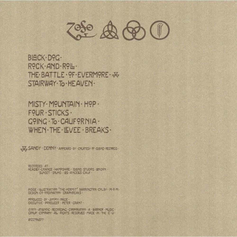 Отличное переиздание одного из лучших альбомов Led Zeppelin . Это четвертый по порядку выхода альбом группы . На обложке нет ни названия пластинки , ни какой другой информации . На обложке изображены четыре особых символа, которые соответствуют каждому из её участников . Полностью сохранено оформление и разворотное исполнение . По звуку все в порядке .