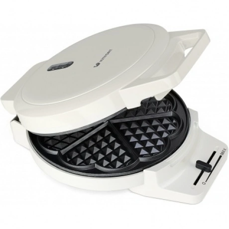 Вафельница Kitfort КТ-1624 представлена в сдержанном черно-белом дизайне и оснащена пластиковым корпусом.