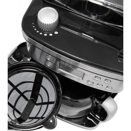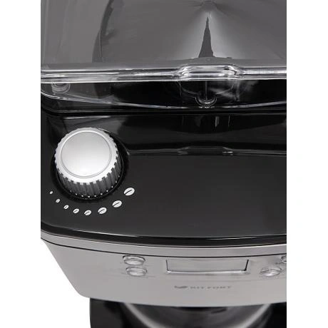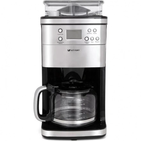 Кофеварка Kitfort KT-705 капельного типа обладает симпатичным черно-серебристым корпусом из пластика. Представленная модель предназначена для приготовления кофе молотого и зернового. С зернами мастерски справляется встроенная в Kitfort KT-705 кофемолка. Объем емкости для кофе достигает 1.5 л, что позволяет приготовить бодрящий напиток на большую компанию. Управляется представленная модель при помощи встроенного дисплея и таймера. Устройство имеет также плиту автоподогрева, что позволяет до 30 минут держать температуру свежеприготовленного напитка. Опция подогрева чашек разогреет их перед наливанием горячего напитка. Длина шнура Kitfort KT-705 в 0.98 м позволяет разместить устройство так, как комфортно пользователю.