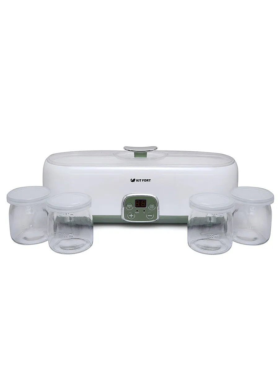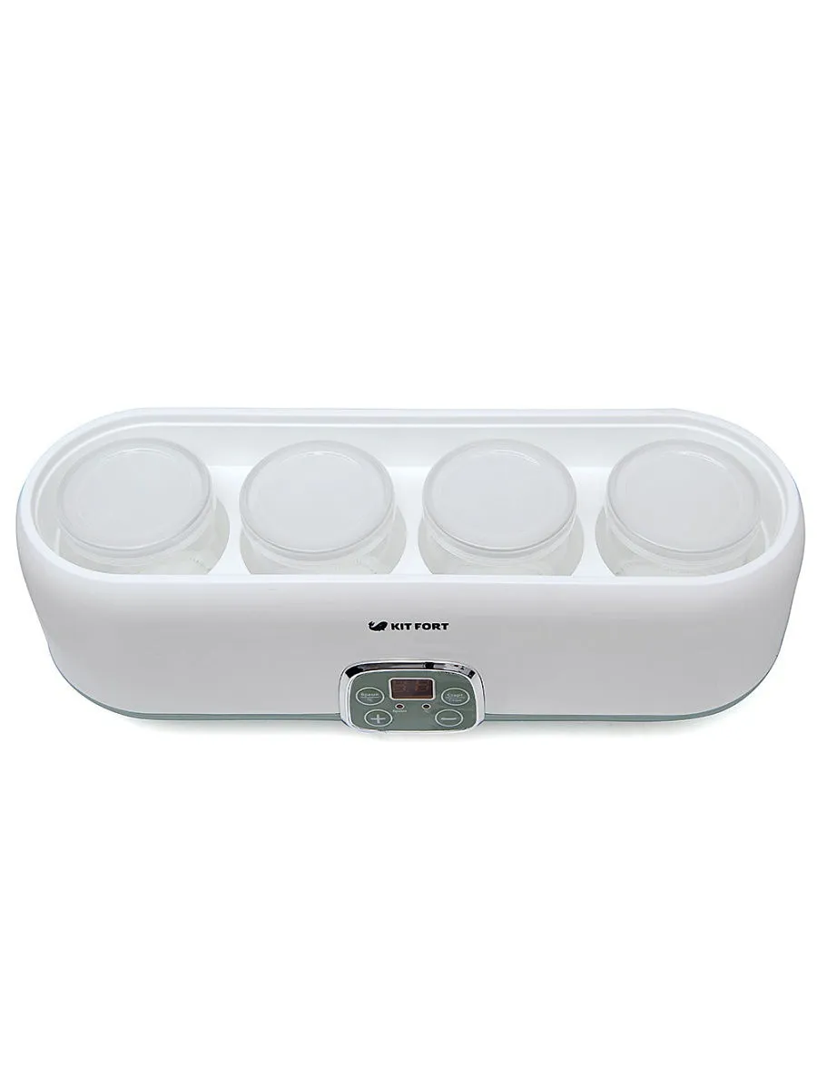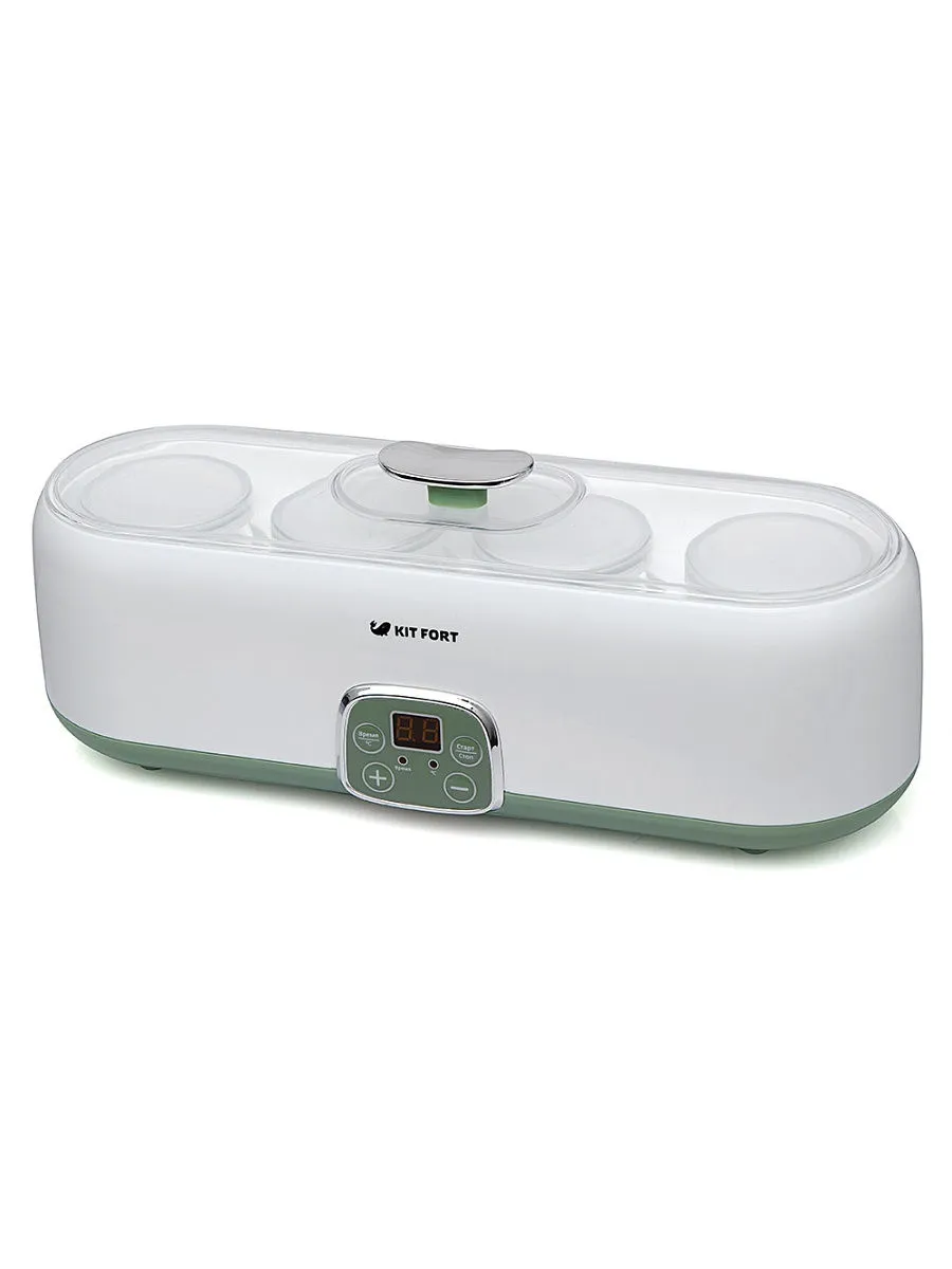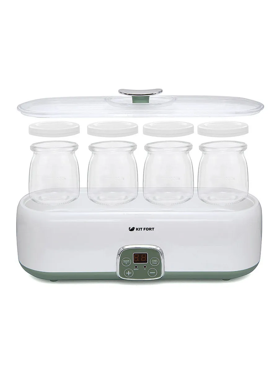 Йогуртница Kitfort КТ-2007 с электронным управлением предназначена для приготовления вкусного и полезного домашнего йогурта. Она имеет компактную овальную форму и вмещает 4 стеклянные баночки, в которых готовый йогурт можно хранить в холодильнике. Йогуртница равномерно нагревает баночки с ингредиентами, поддерживая заданную температуру.