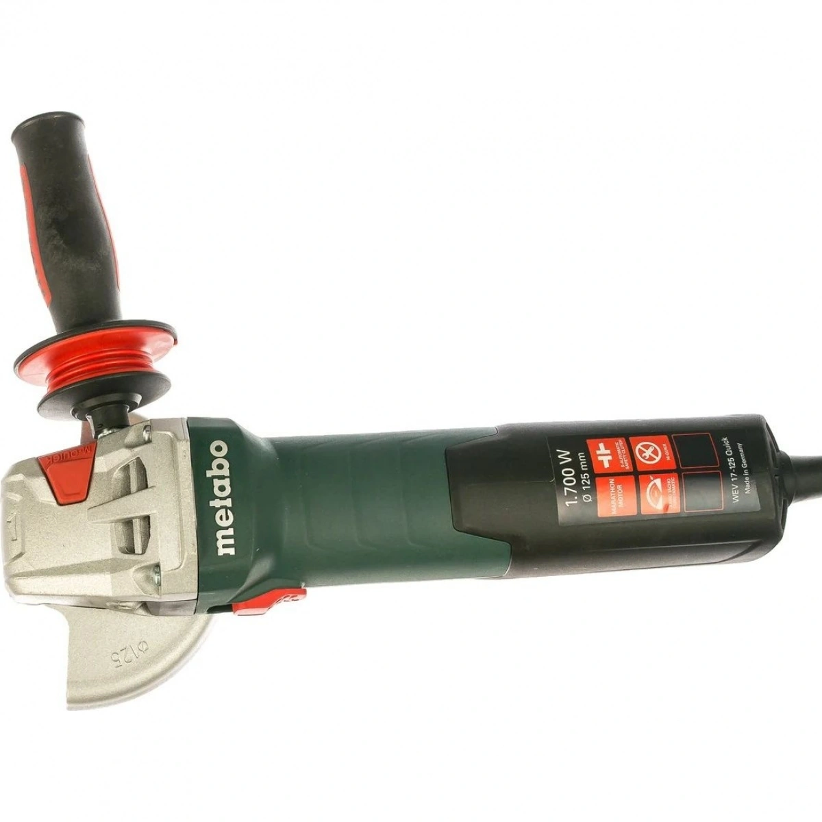 Угловая шлифмашина Metabo WEV 17-125 Quick 600516000 оснащена новым запатентованным двигателем Metabo Marathon, который имеет на 50% выше крутящий момент и на 20% выше перегрузочную способность. Регулировка оборотов позволяет подстраиваться под конкретный тип материала. Для установки кожуха не требуется инструмент. Дополнительная рукоятка является антивибрационной, что делает рабочий процесс гораздо комфортнее.
