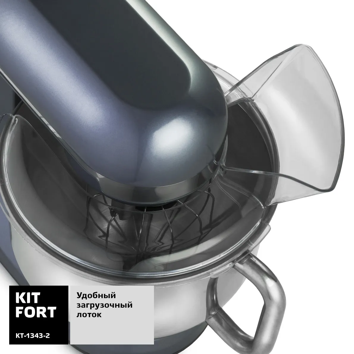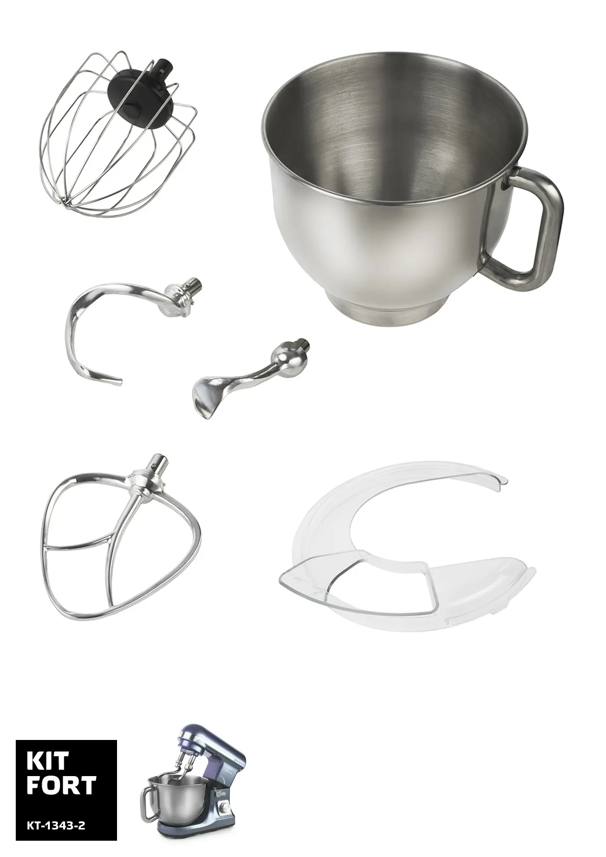 Планетарный миксер Kit Fort КТ-1343, цвет черный. Миксер хорошо закрепляется на столе-благодаря специальным присосками, во время работы никакой вибрации, работает бесшумно. Насадки хорошо, прочно закрепляются. Чашу можно вытащить не снимая насадки-при поднятом моторном отсеке. Сама чаша хорошо фиксируется.
