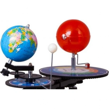 Настольная механическая модель для демонстрации движения Земли и Луны вокруг Солнца. Наглядное пособие для изучения астрономии и географии. Все основные элементы прибора изготовлены из прочного и безопасного пластика. Диаметр модели Солнца составляет 100 мм, Земли – 85 мм, Луны – 18 мм. Прибор приводится в движение специальной ручкой. Внутри модели Солнца находится яркая лампочка.