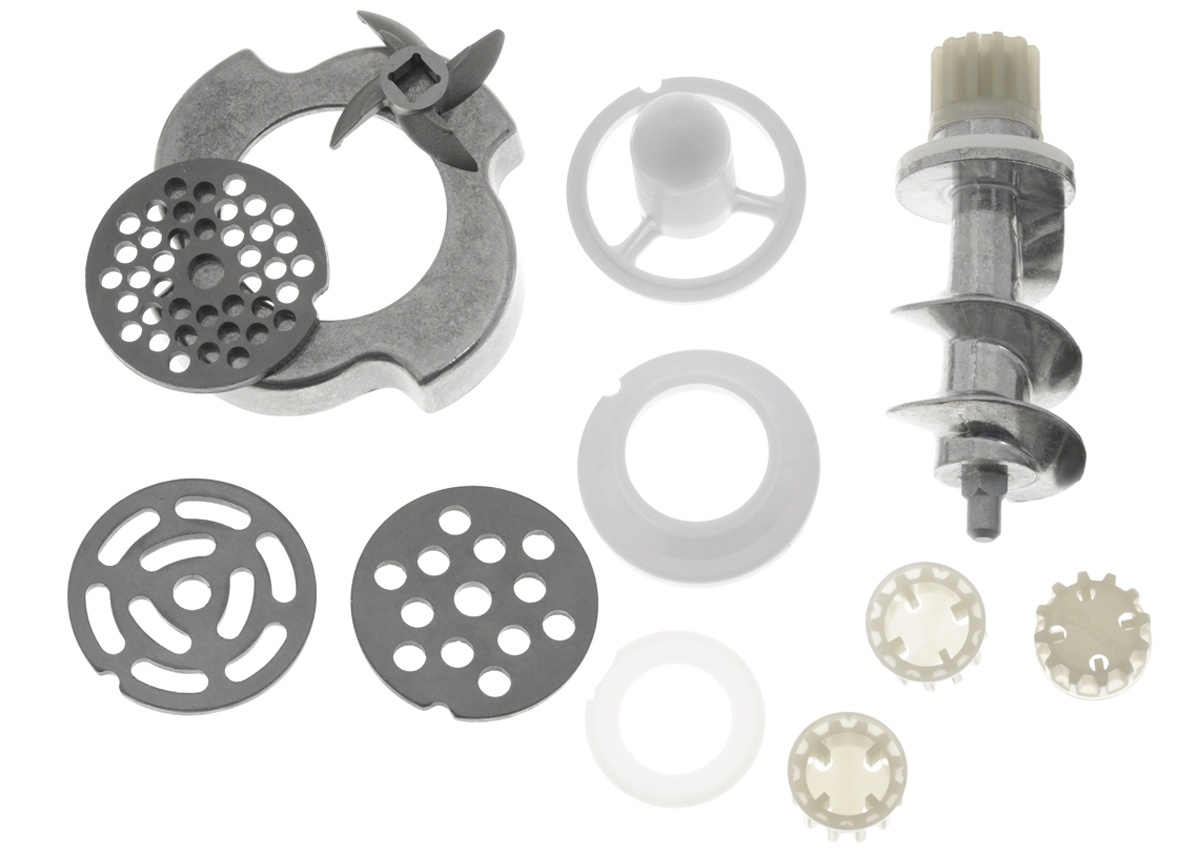 Мясорубка, решетка с отверстиями 5 мм, решетка с отверстиями 7 мм, решетка с овальными отверстиями, нож с саблевидной режущей кромкой, приставка-овощерезка, инструкция