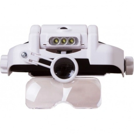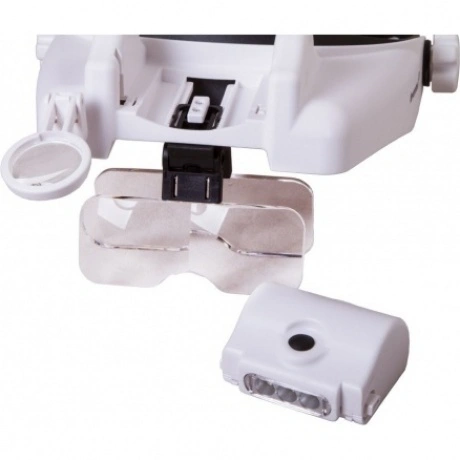 Налобная лупа Levenhuk Zeno Vizor H7 уникальна тем, что позволяет гибко настраивать кратность оптики. В комплекте идут пять сменных линз с разным увеличением. На лупу можно установить сразу две линзы, чтобы получить большее увеличение. А поворотная линза для правого глаза добавит еще 8 крат к мощности оптики. Если эта линза не нужна, ее можно просто отвернуть в сторону. При необходимости весь блок с линзами можно убрать вверх, например для того, чтобы посмотреть на рабочую область невооруженным глазом. Такой богатый выбор увеличений делает Levenhuk Zeno Vizor H7 универсальным оптическим прибором для любой работы, требующей точности и аккуратности. Однократная линза превратит лупу в защитные монтажные очки, остальные линзы пригодятся при ремонте электроники, часовых механизмов, ювелирных изделий. Домашнее хобби тоже станет более интересным – лупа Levenhuk Zeno Vizor H7 поможет в моделизме и рукоделии. Благодаря встроенной подсветке лупу можно использовать даже в полной темноте. Подсветка состоит из батарейного отсека и трех ярких светодиодов. Свет от нее получается ровным и ярким, угол наклона подсветки можно откорректировать. Удобное крепление надежно фиксирует лупу на голове, оставляя руки полностью свободными для работы. Длина крепления регулируется.