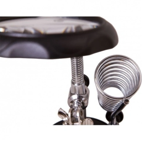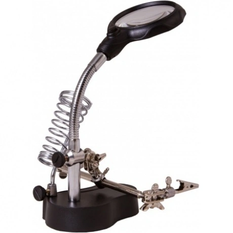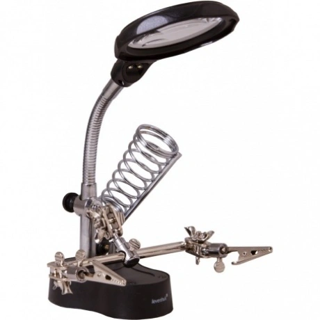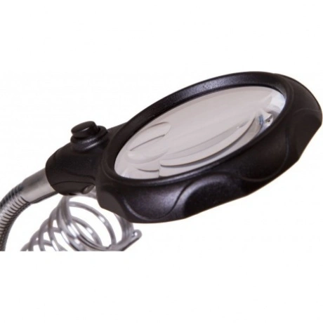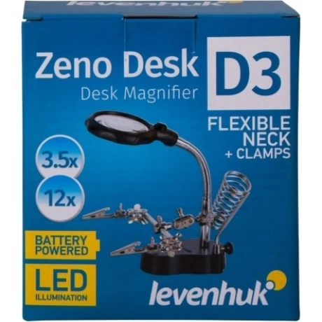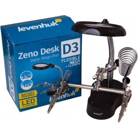 Настольная лупа Levenhuk Zeno Desk D3 создана специально для тех, кто занимается ремонтом плат, пайкой, моделированием, ювелирными и часовыми работами. Держатель для инструментов и держатели «третья рука» станут настоящей находкой для человека, который любит работать руками. Бифокальная линза дает два увеличения. На большом диаметре кратность составляет 3.5х, на малом – 12х. Лупа зафиксирована на гибком штативе и снабжена встроенной подсветкой, состоящей из двух ярких светодиодов. Выключатель подсветки расположен у основания линзы.