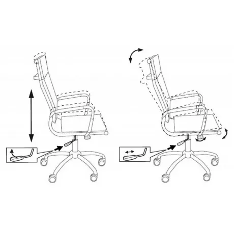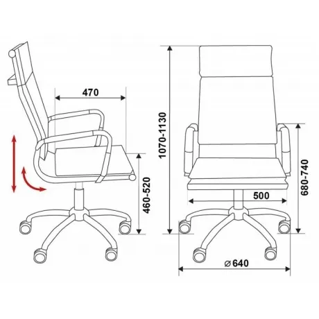 Механизм качания с регулировкой под вес и фиксацией в вертикальном положении. Регулировка высоты (газлифт). Каркас металлический хромированный. Подлокотники металлические хромированные с накладками из экокожи