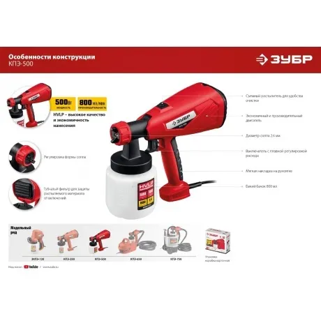 Описание товара Краскопульт Зубр КПЭ-500 550Вт бак:800мл 800мл/мин