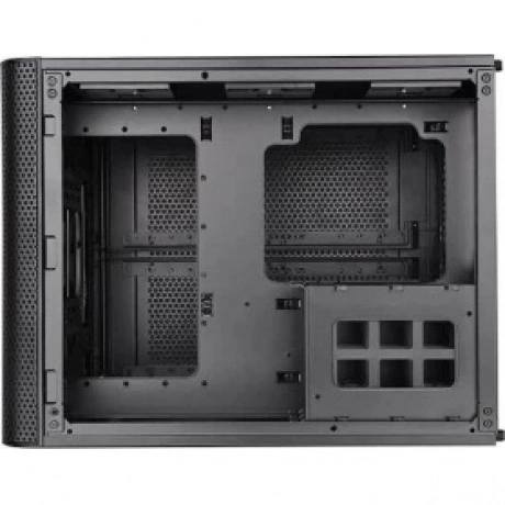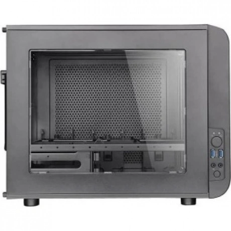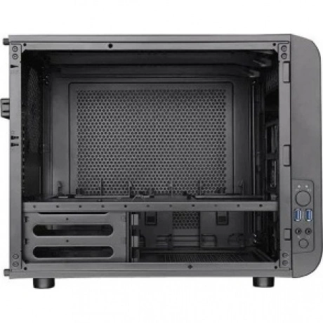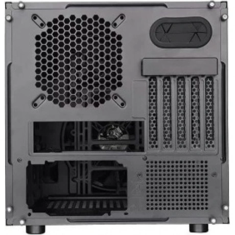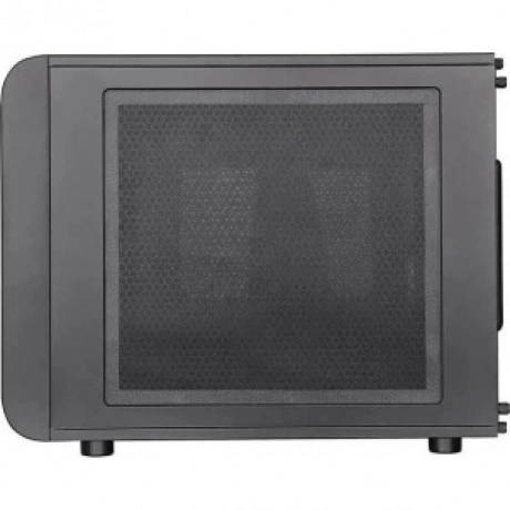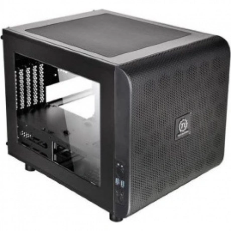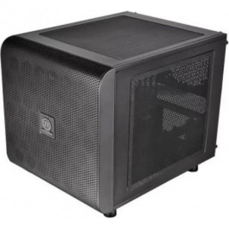 Корпус Thermaltake Core V21 стальной представлен в необычном дизайне в виде черного куба. Данная модель с типоразмером MicroTower предназначается для оснащения игровых компьютеров стандарта MicroATX. Предусматривается наличие большого бокового окна. Корпус весит 6.5 кг, имеет габариты 32x42.4x33.6 см и поставляется с набором крепежных винтов, кабельными стяжками и сеткой. Корзины накопителей расположены вдоль корпуса, а блок питания устанавливается в нижней части. Данное комплектующее изделие оснащено пятью слотами расширения и тремя скрытыми отсеками 3.5, совместимыми с устройствами 2.5. Допускается установка видеокарты длиной до 35 см и кулера высотой до 18.5 см. Модель Thermaltake Core V21 оснащена двумя USB-портами версии 3.0 и jack-аудиоинтерфейсами для работы с наушниками и микрофоном. В комплектацию включен вентилятор на 20 см. Корпус дополнен вырезом для кулера, безвинтовыми креплениями слотов расширения и отсеков 3.5 и 5.25, а также позволяет скрывать кабели за задней стенкой.