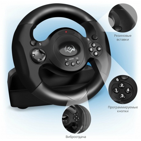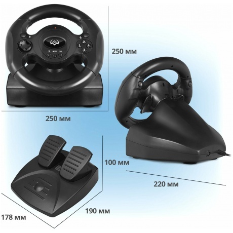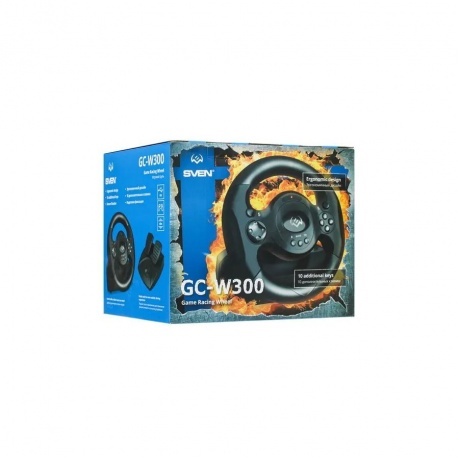 Руль SVEN GC-W300 представляет собой эргономичное устройство, разработанное специально для игр. С таким приспособлением вы сможете создать настоящую имитацию нахождения за рулем во время напряженной гонки, и одержать победу благодаря сверхбыстрому отклику. Модель подключается к PC, используя для этого шнур с разъемом USB. Диаметр руля SVEN GC-W300 соответствует 22.5 см. Он поддерживает угол поворота, равный 180 градусов, что позволяет совершать различные маневры на трассе и выходить победителем даже из сложных ситуаций. Для увеличения реалистичности езды этот руль поддерживает виброотдачу. Его конструкция предусматривает наличие восьмипозиционного джойстика и десяти кнопок. На поверхности руля располагаются резиновые вставки, которые исключают скольжение рук во время управления игровыми действиями. Устройство фиксируется к столу, используя для этого резиновые присоски. Модель способна функционировать в аналоговом и цифровом режимах. В комплекте предусмотрены педали.