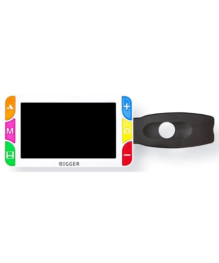 Электронная лупа Bigger B3-50TV – многофункциональный увеличительный прибор. Она снабжена качественным цветным ЖК-экраном, можно выбрать один из контрастных 26 режимов просмотра. Вот некоторые из них: полноцветный, режим повышенной контрастности (улучшения цвета), негатив, монохромный, синий на белом фоне, белый на оранжевом фоне, желтый на зеленом фоне и другие. Диагональ экрана составляет 5, разрешение: 800х480 пикселей, частота смены кадров: 60 в секунду. Максимальное увеличение лупы составляет 48x, минимальное – 4x. Увеличение меняется плавно. У прибора есть две камеры с разным фокусным расстоянием, обе имеют разрешение 3 Мпикс. Благодаря этому при помощи цифровой лупы можно не только читать текст, рассматривать иллюстрации и писать, но и изучать расположенные на большом расстоянии объекты (вывески, номера домов, надписи на остановках). У лупы есть удобная съемная подставка. Яркость экрана регулируется в зависимости от уровня освещенности. Есть отключаемая светодиодная подсветка. Изображения можно сохранить в памяти прибора и просмотреть позднее. Есть возможность подключить электронную лупу к телевизору или монитору ПК: для этого на корпусе есть разъемы RCA и HDMI (кабель RCA идет в комплекте). Увеличительный прибор питается от встроенного аккумулятора, время работы составляет около 4 часов. Столько же времени понадобится для полной зарядки. Для экономии энергии предусмотрена функция автоматического отключения при длительном бездействии. У лупы удобный эргономичный корпус, крупные кнопки с рельефными символами на них. Интересная функция – режим фонарика, который поможет ориентироваться в сумерках или в темном помещении. Цифровая лупа может также служить часами: она умеет выводит на экран крупными символами дату и время.