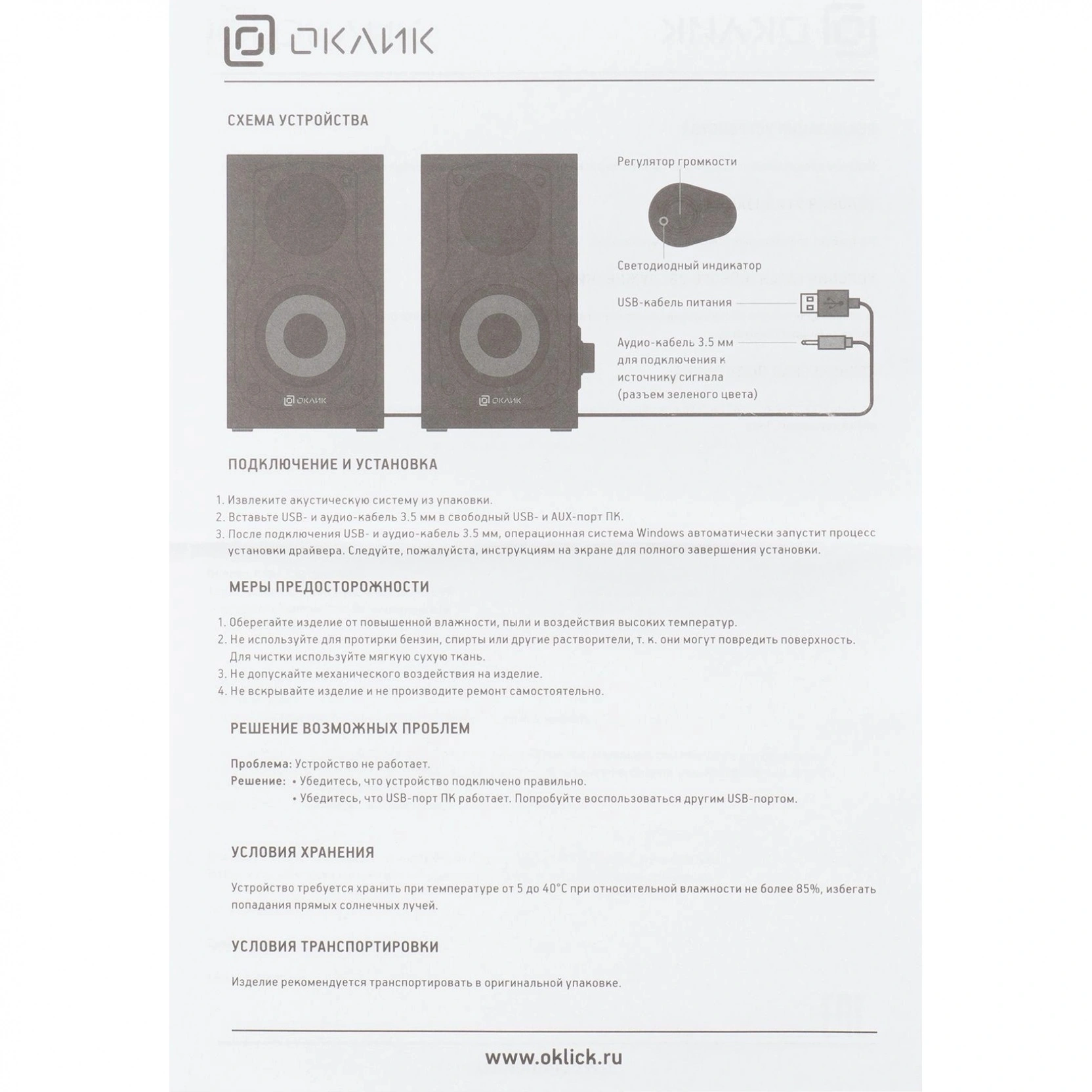Колонки Oklick не оснащены разъемом для наушников и USB-портом для флешки, однако это позволяет сосредоточиться именно на функции воспроизведения качественного звука. При весе всего 1,26 кг, эти колонки являются портативным и удобным устройством для использования в ежедневной работе за компьютером.