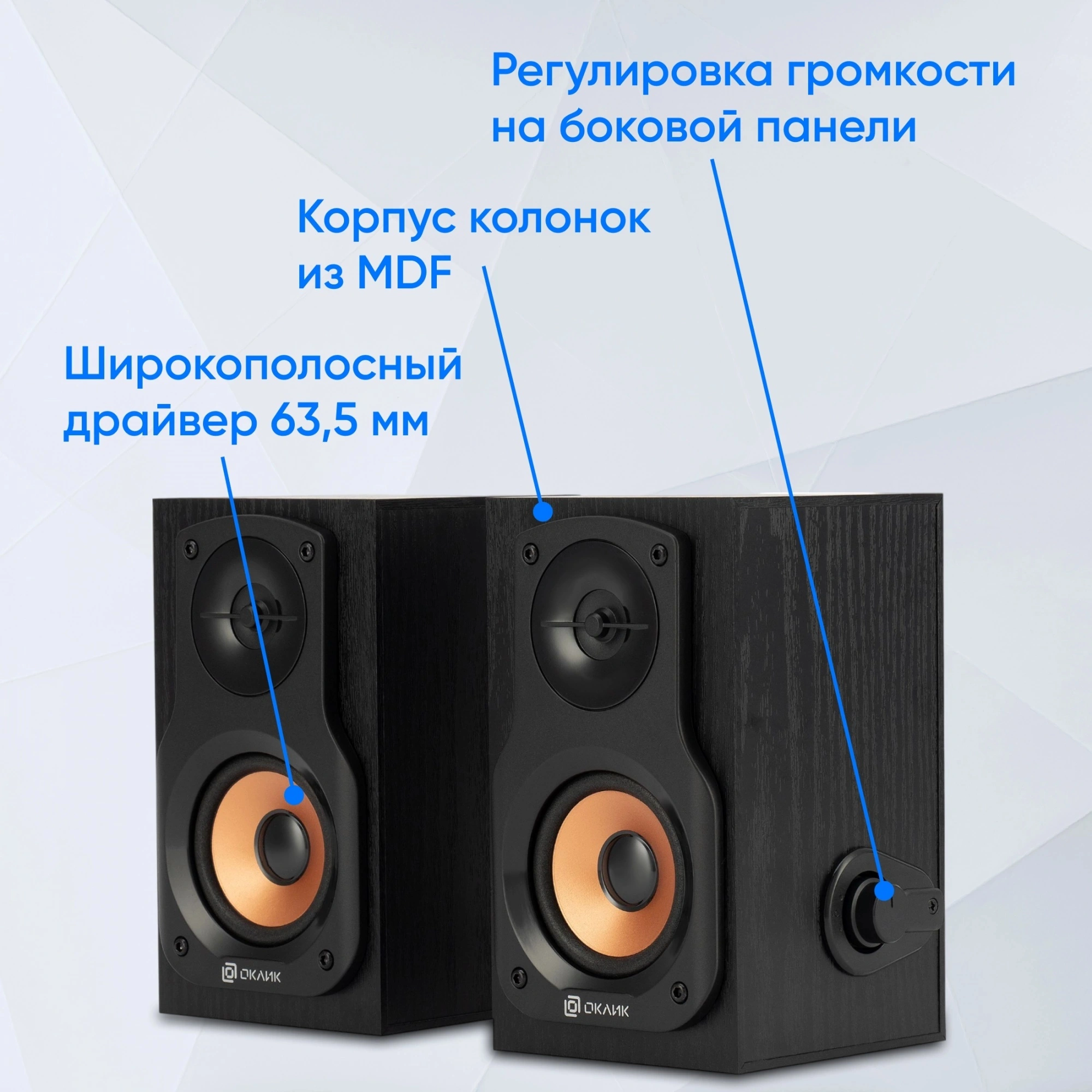 Компьютерные колонки Oklick — это отличное решение для тех, кто ищет качественный звук в компактной и стильной форме. Этот комплект включает две колонки, выполненные с использованием современных материалов: фронтальные колонки имеют корпус из МДФ, что обеспечивает устойчивость и минимум вибраций, тогда как общий корпус колонок выполнен из прочного пластика, что делает их легкими и удобными в размещении.