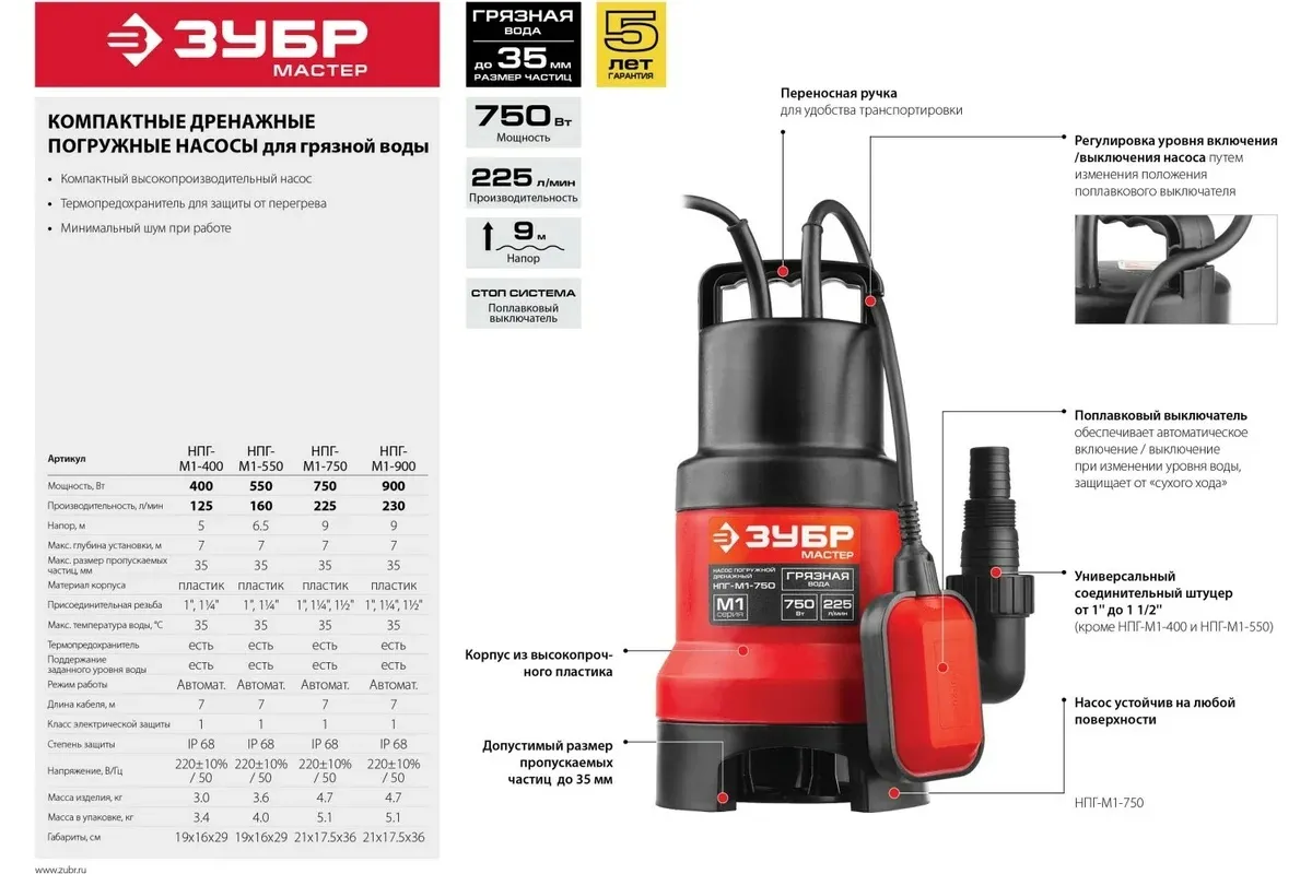 Описание товара Насос погружной дренажный Зубр Мастер М1 НПГ-М1-750