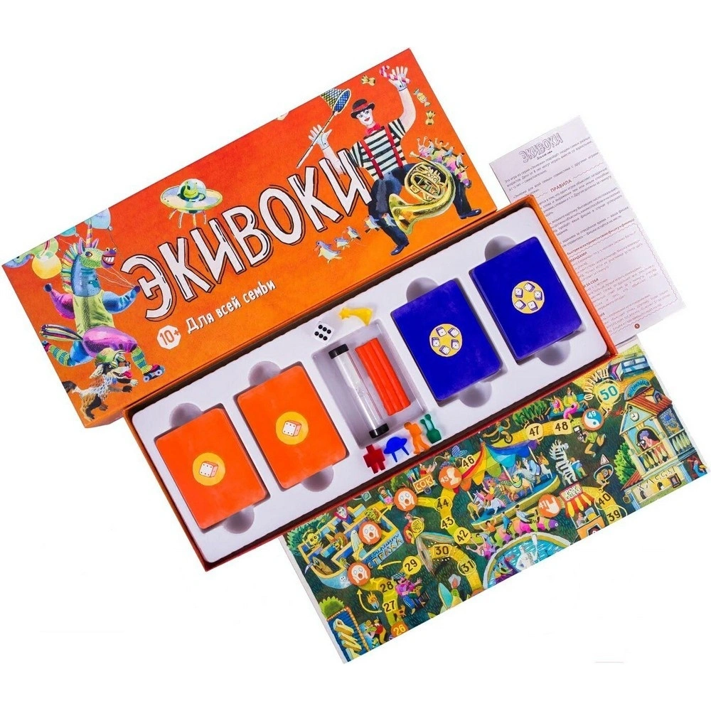 Новые Экивоки — всё та же бодро-задорная игра на объяснение слов, но теперь с новым полем и новыми заданиями. Играть просто: бросайте кубик — он подскажет, какое слово с карточки надо объяснить и каким способом. Вылепить из пластилина, показать жестами, произнести наоборот. Чем быстрее вас понимают, тем дальше вы движетесь к финишу.