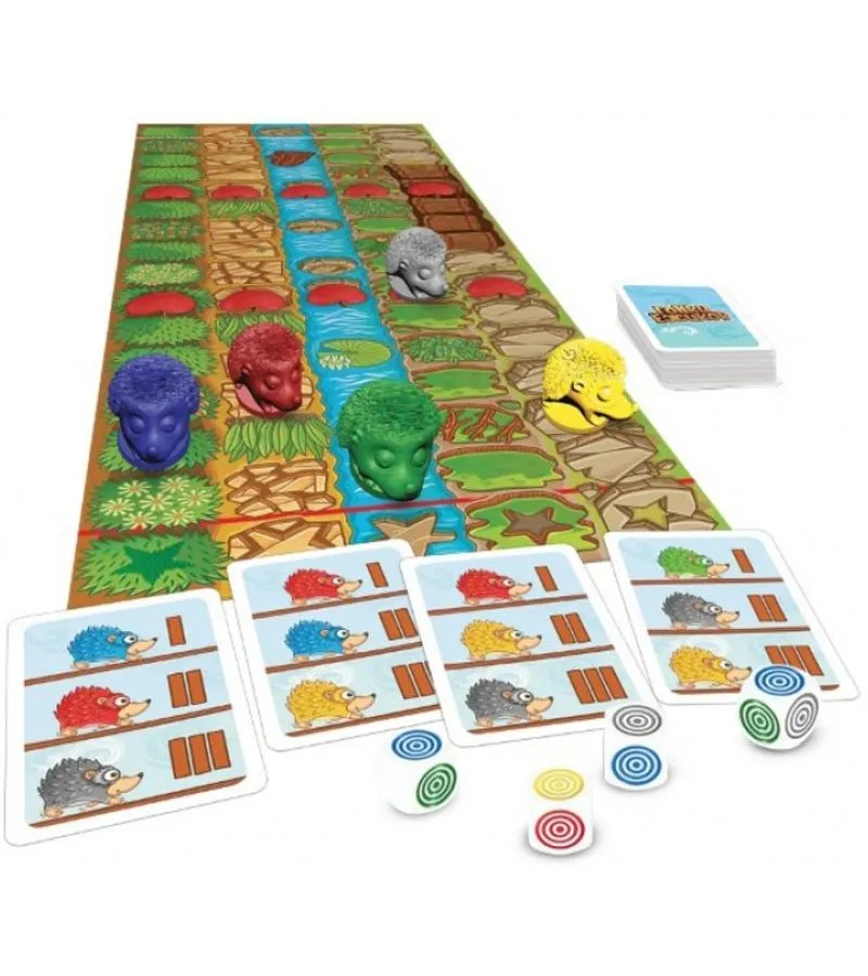Задача игрока довести трёх из пяти ёжиков к финишу в определённом порядке, заданном в вашей карточке в начале игры. Бросайте кубики и выбирайте кто из ёжиков продвинется дальше. Но это далеко не всё. Игра насыщена разнообразными уловками, отчего играть будет интересно и взрослым.
