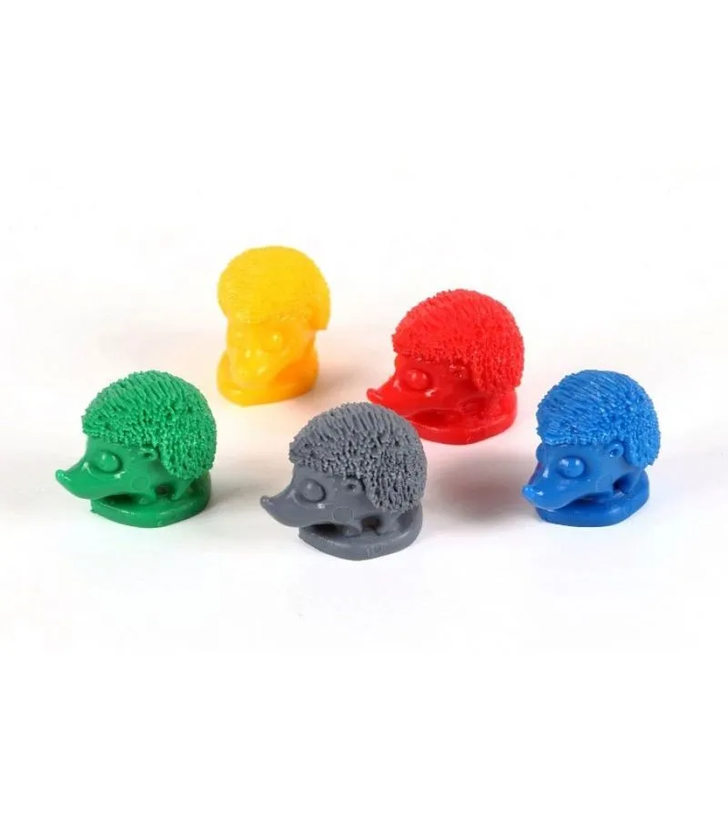 игровое поле, 4 шестигранных кубика с цветными сторонами, 5 фишек ёжиков, 60 карточки, правила игры