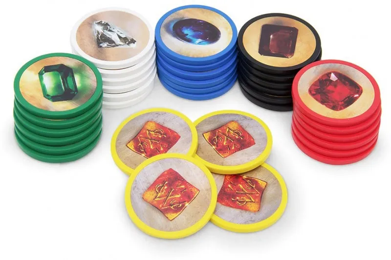 7 жетонов изумрудов (зелёные), 7 жетонов сапфиров (синие), 7 жетонов рубинов (красные), 7 жетонов бриллиантов (белые), 7 жетонов оникса (чёрные), 5 жетонов золота (жёлтые) , 90 карт Развития , 10 тайлов Вельмож, правила игры