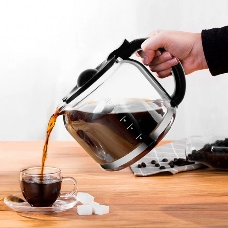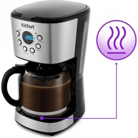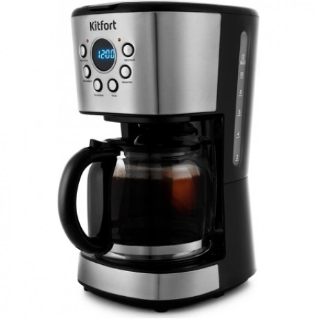 Капельная кофеварка Кtfort КТ-728 поможет приготовить ароматный кофе из молотого кофе. Она компактная и простая в использовании. Кофеварка идеально подойдёт для приготовления кофе в домашних условиях или в офисе. Режим автозапуска позволит вам настроить автоматическое приготовление кофе к нужному часу без вашего участия. В установленное время кофеварка автоматически начнёт приготовление, а вам останется только подойти и насладиться вкусным ароматным напитком. По окончании приготовления кофеварка перейдёт в режим подогрева. Платформа с подогревом, на которой стоит кофейник с готовым кофе, будет горячей в течение 40 минут, затем кофеварка выключится. Кофеварка оборудована противокапельной системой - затвором, приостанавливающим подачу кофе при вынимании кофейника из кофеварки. Вы можете налить кофе в чашку, не дожидаясь окончания приготовления. Резервуар ёмкостью 1.5 л позволяет за один раз приготовить кофе на 12 чашек ёмкостью 120 мл. Корпус кофейника прозрачный, поэтому вы всегда можете видеть, сколько кофе еще осталось. Кофеварка оснащена многоразовым нейлоновым фильтром, который удобно мыть после приготовления кофе и использовать снова.