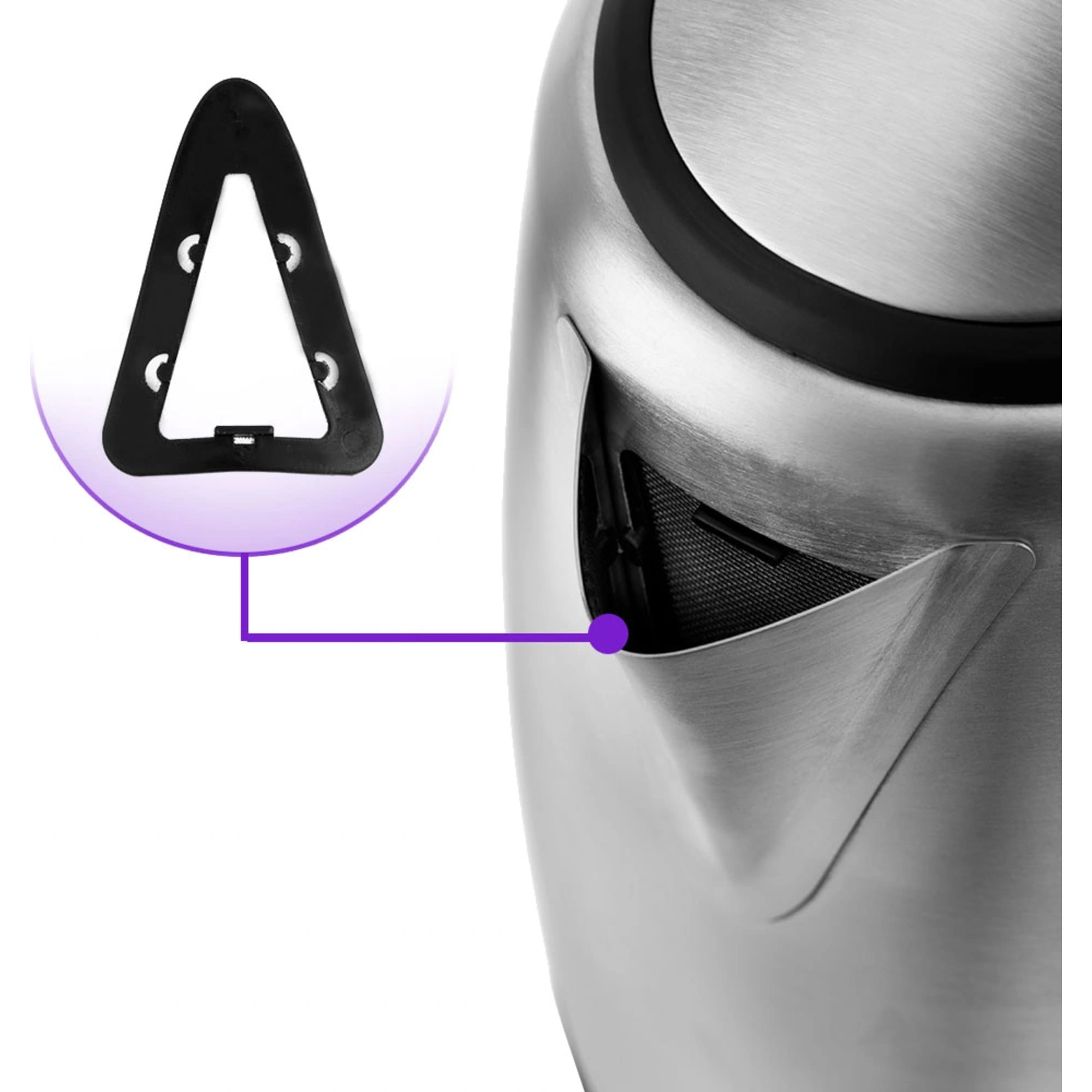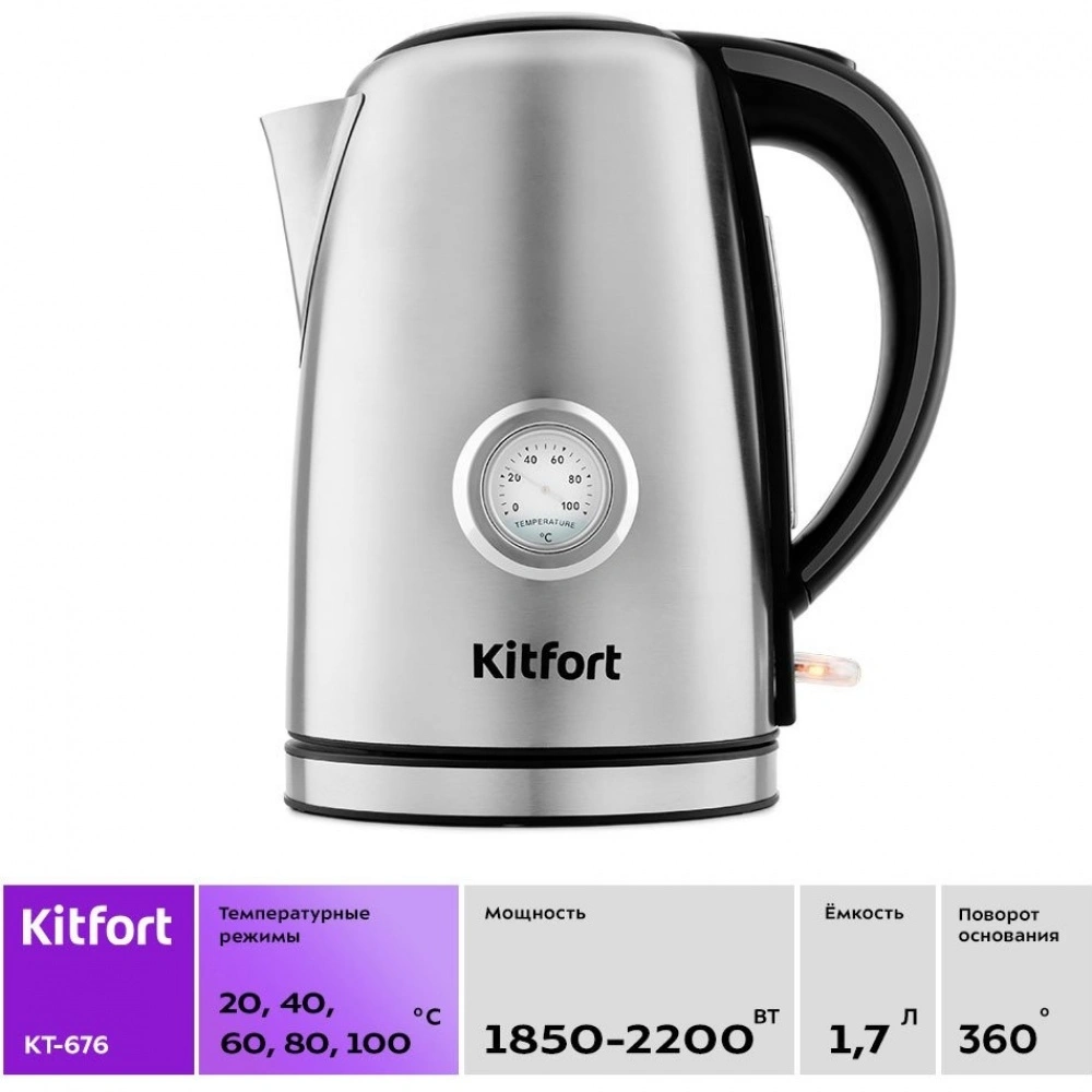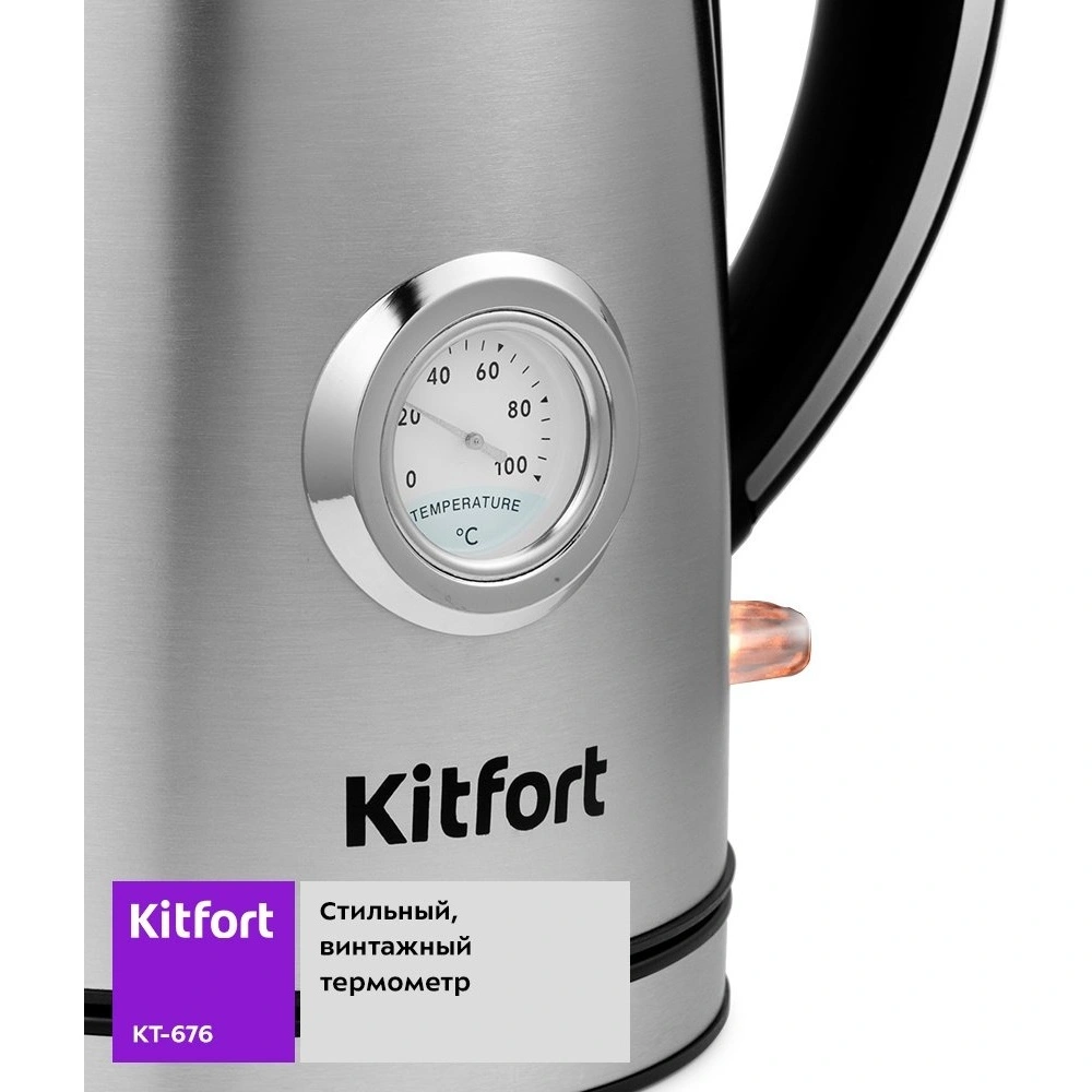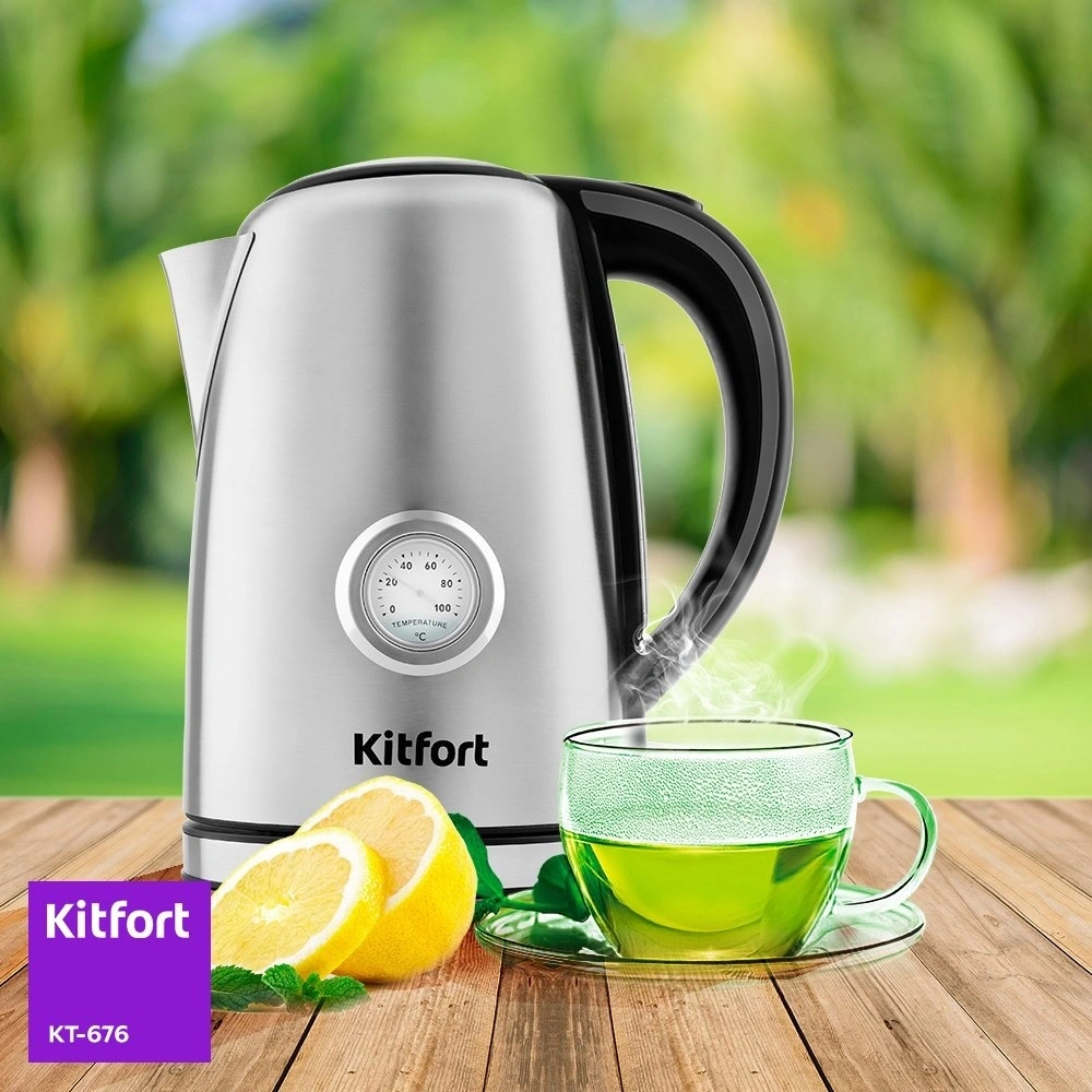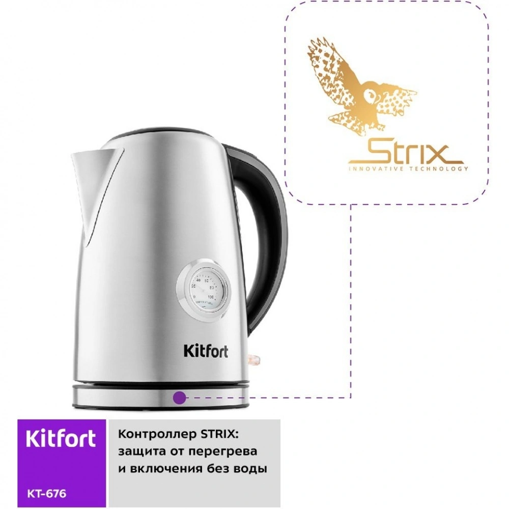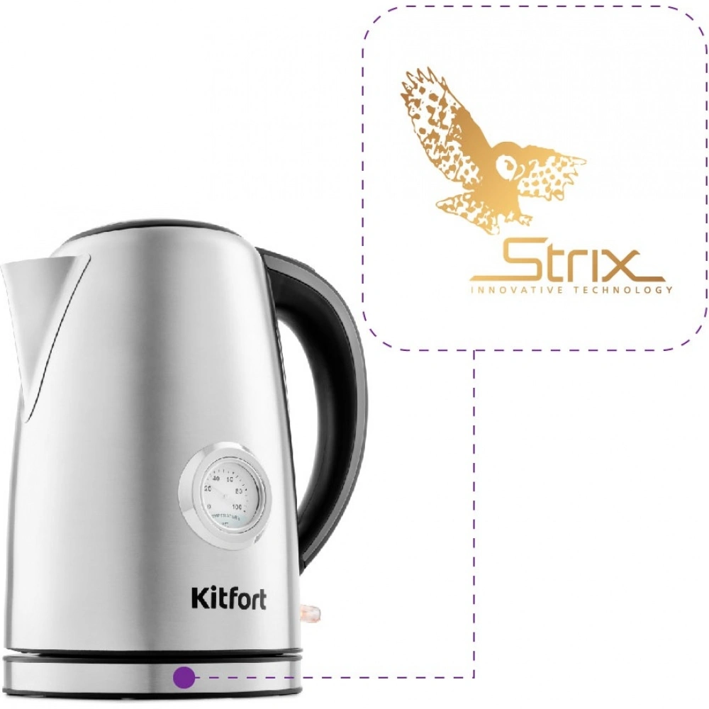 На корпусе чайника Kitfort KT-676 расположен термометр, который показывает температуру воды. Это удобно, если вы готовите напитки, для которых требуются определенная температура воды, например, зеленый чай, белый чай, кофе и т. д. Корпус чайника выполнен из нержавеющей стали. Внутренняя поверхность чайника полностью состоит из металла, благодаря чему вода не соприкасается с пластиком. Ручка чайника пластиковая, не нагревается и удобно лежит в руке. Чайник оснащён контроллером Strix - № 1 среди поставщиков компонентов для электрочайников. Он устраняет риски короткого замыкания и возгорания прибора. Обеспечивает защиту при закипании, при включении чайника без воды и при снятии с базы во время работы. В носике чайника расположен съёмный фильтр от накипи из нейлона, который задерживает частички накипи и предотвращает их попадание в чашку.