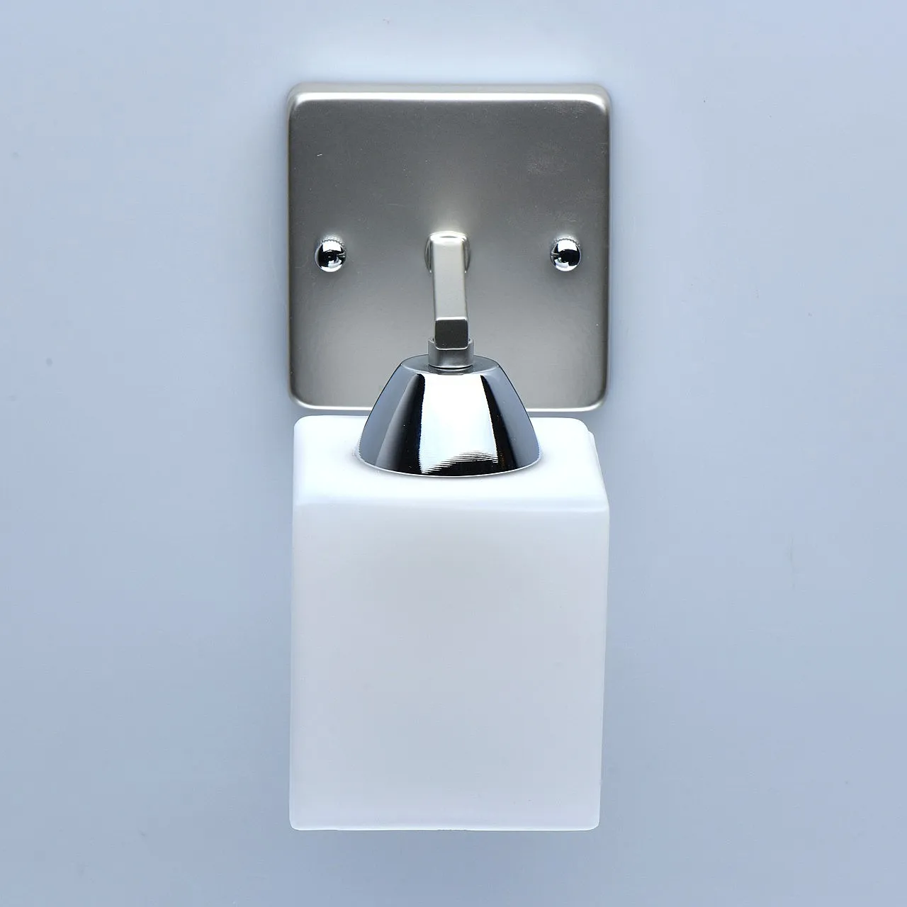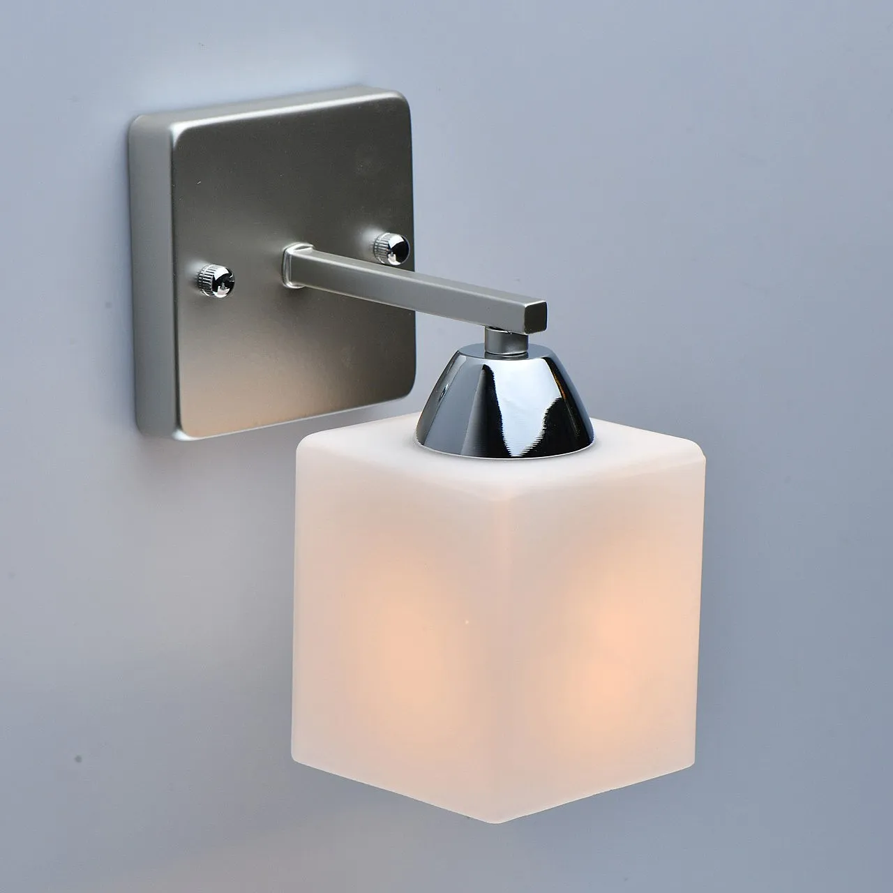 Геометрические формы основания поддержаны кубической формой плафона Актуальная комбинация металлов цвета перламутрового серебра и глянцевого хромаПлафон матового белого стекла создает мягкое освещение.Полная семья из бра, светильников на 4 и 8 ламп