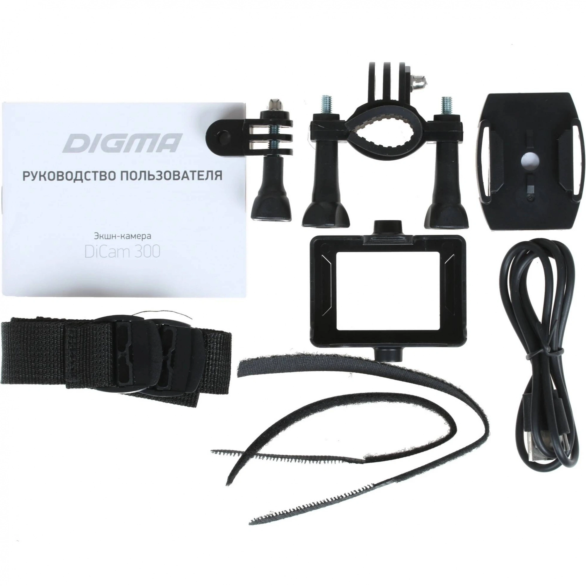 камера, водонепроницаемый бокс, основное крепление, крепление на руль велосипеда, крепление на шлем, адаптер-переходник, адаптер на резьбу, рамка, повязка-бандаж, аккумулятор, USB-кабель, руководство пользователя, гарантийный талон