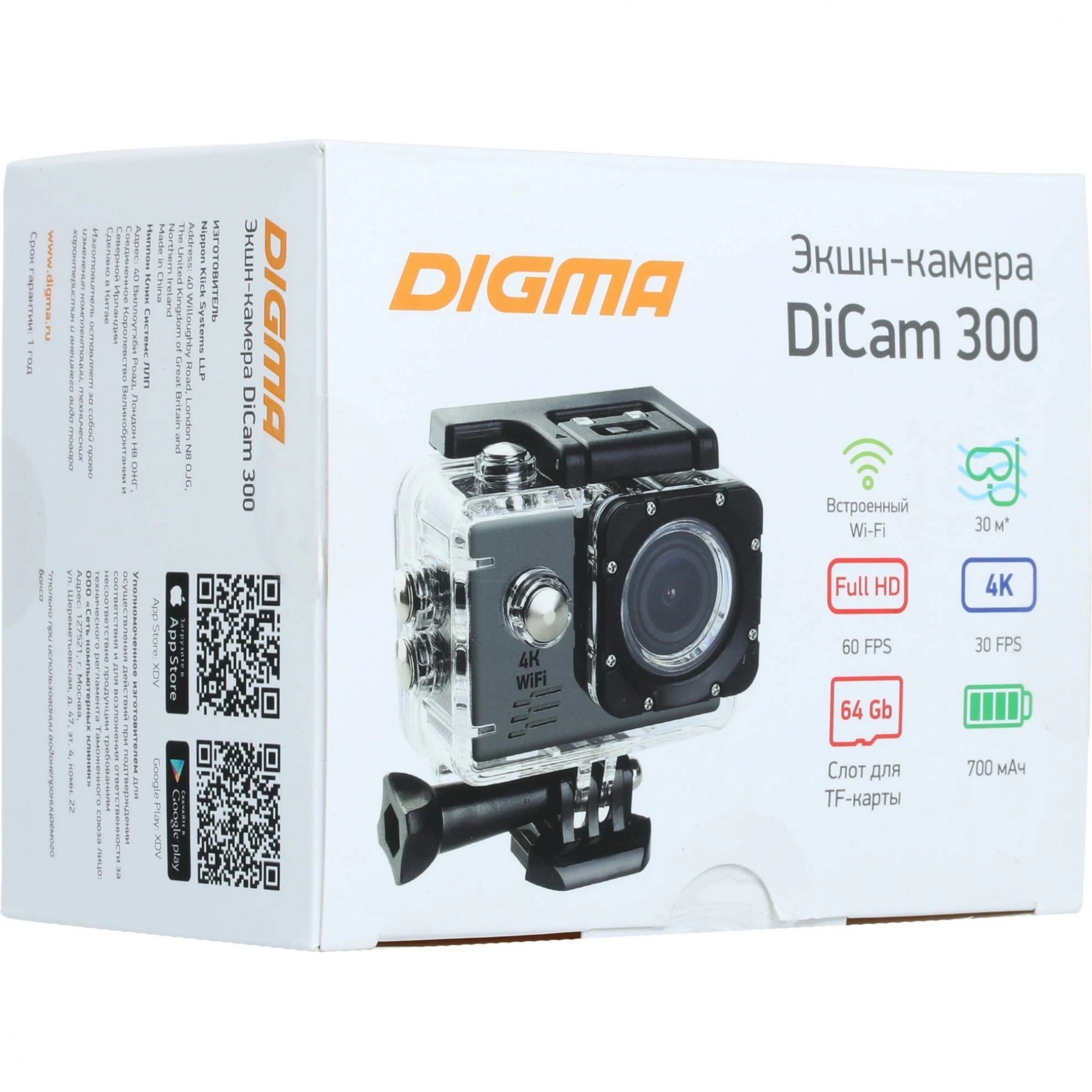 Экшн-камера Digma DC300 станет прекрасной спутницей для тех, кто отдает предпочтение активному отдыху. Максимальное разрешение видеозаписи составляет 30 кадров/с при разрешении 4K, поэтому ваши ролики будут получаться невероятно четкими, контрастными и яркими. А возможность записи звука сделает видео еще более реалистичным и захватывающим. Можете не волноваться, что в экшн-камере Digma DC300 в самый важный момент закончится место для видеозаписи, ведь в ней предусмотрена поддержка карт памяти до 64 Гб.