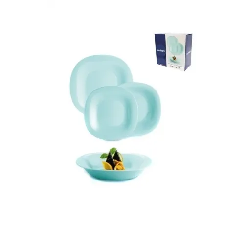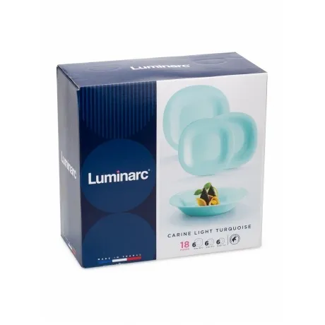 Бирюзовый столовый сервиз LUMINARC КАРИН ЛАЙТ ТЮРКУАЗ выполнен из высококачественного ударопрочного стекла. Его можно использовать самостоятельно и в комбинации с тарелками и салатникам других цветов из той же коллекции. Контрастным сочетанием могут стать бирюзовый и черный. А от сочетания бирюзового с белым веет свежестью. Бирюзовый и серый - сдержанность и респектабельность. Набор подходит для ежедневного использования, но правильно подобранные аксессуары легко превратят обычную сервировку в праздничную. Можно использовать в посудомоечной машине и СВЧ. Сервиз рассчитан на 6 персон и включает 18 предметов: тарелка обеденная 27 см - 6 шт, тарелка глубокая 21 см - 6 шт, тарелка десертная 19 см - 6 шт.