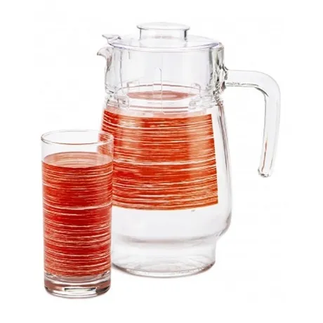 Набор питьевой LUMINARC БРАШМАНИЯ РЕД из прозрачного закаленного стекла с нежным рисунком, который нанесен надежно и не смоется в посудомоечной машине даже после многих циклов мытья. Крышка предохраняет содержимое от пыли и насекомых. Стаканы подходят не только для воды и соков - но и для напитков со льдом и даже для десерта. Можно мыть в посудомоечной машине и использовать в СВЧ. Состав набора: кувшин с крышкой 1.6 л - 1 шт, стакан 270 мл - 6 шт.