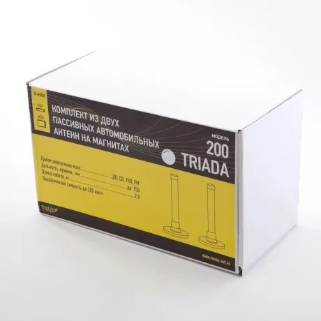 Триада 200 это съёмная пара радио и тв антенны в автомобиль, которые предназначены для приема в городе. Данная модель с усиленным магнитным основанием держится на скорости до 100 км/ч. Длина кабеля составляет 2,5м. Устанавливаются в задней части крыши автомобиля. Одна антенна с радиоштекером, другая с телевизионным МОНО 3,5. Также данные антенны (тип Рожки), устанавливаются по 2 шт для красоты.