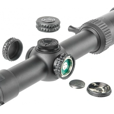 Охотничий прицел в металлическом корпусе имеет герметичное исполнение и заполнен инертным газом, который предотвращает от образования конденсата при резком изменении температуры окружающей среды. Большой выходной зрачок окуляра обеспечивает широкое поле зрения, благодаря чему не происходит затемнения поля зрения при перемещении глаз охотника относительно оптической оси прицела. Прицел может эксплуатироваться в диапазоне температур от -25 до 40 градусов С. Важной особенностью данной модели является наличие мощной спиральной пружины в конструкции, которая стабилизирует оптический блок с прицельной сеткой при выстреле. Светопропускание прицела более 92%, это позволяет комфортно охотиться при недостаточном освещении. Благодаря наличию зеленой подсветки прицельной марки, прицел Veber Wolf 1-6x24 GB FD «Загонник» можно использовать для охоты в сумерках, для прочих ситуаций подойдет синяя подсветка. Прицельная сетка конструктивно расположена во 2-ой фокальной плоскости прицела — при изменении кратности сетка визуально не меняется, сохраняя размер в поле зрения. Цена деления (щелчка) механизма ввода поправок составляет 1/2“ или 15 мм на дистанции 100 м.