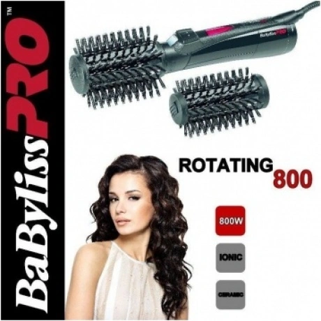BaByliss Pro Rotating 800 BAB2770E – профессиональная фен-щетка, позволяющая сушить волосы и делать укладку одновременно. 2 брашинг-насадки диаметром 40мм и 50мм имеют керамическое покрытие. Их уникальность в возможности вращения в двух направлениях. Это помогает легко и быстро создавать прикорневой объем, выпрямлять вьющиеся или завивать прямые волосы. Натуральные и нейлоновые щетинки с закругленными кончиками не травмируют кожу головы во время сушки. Функция ионизации насыщает поток воздуха отрицательными частицами, которые защищают волосы от пересушивания, исключают электризацию, делают их гладкими и блестящими.