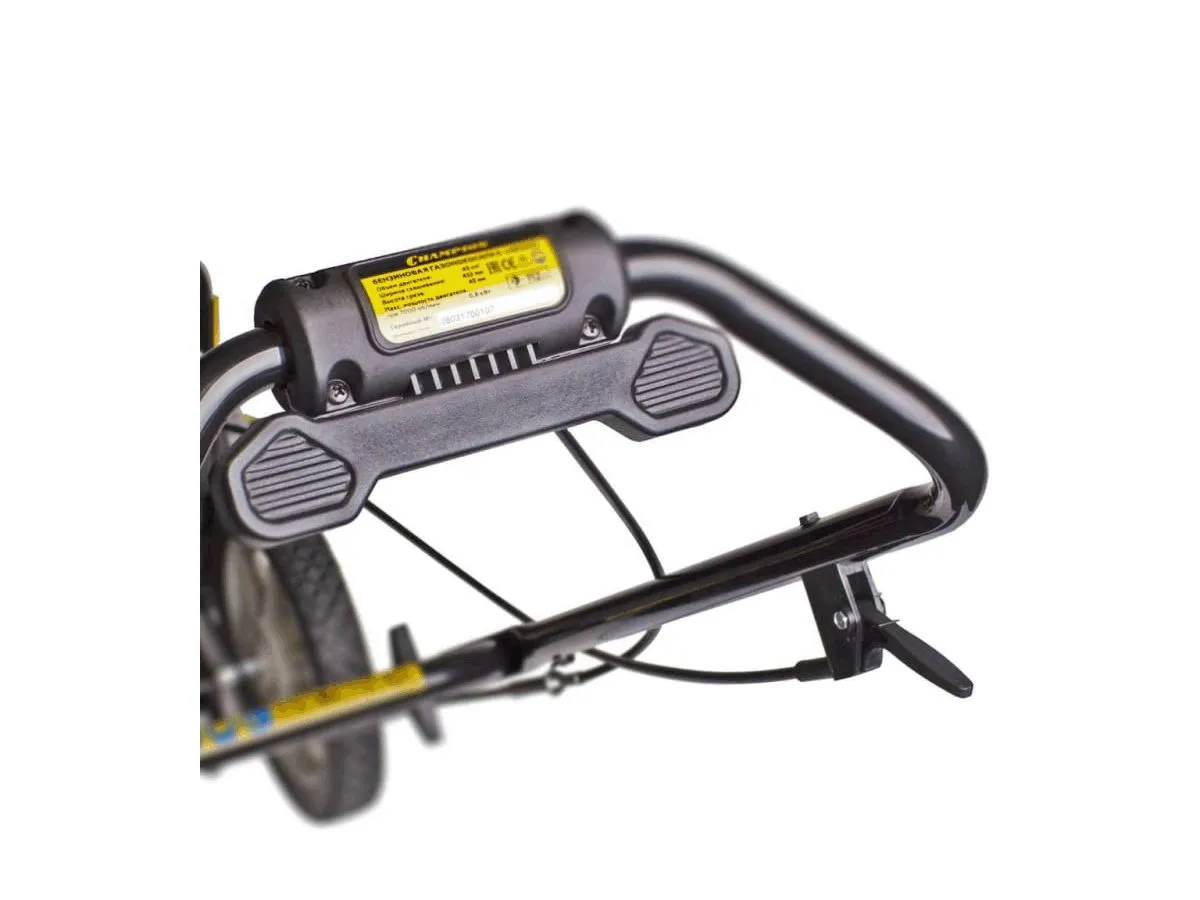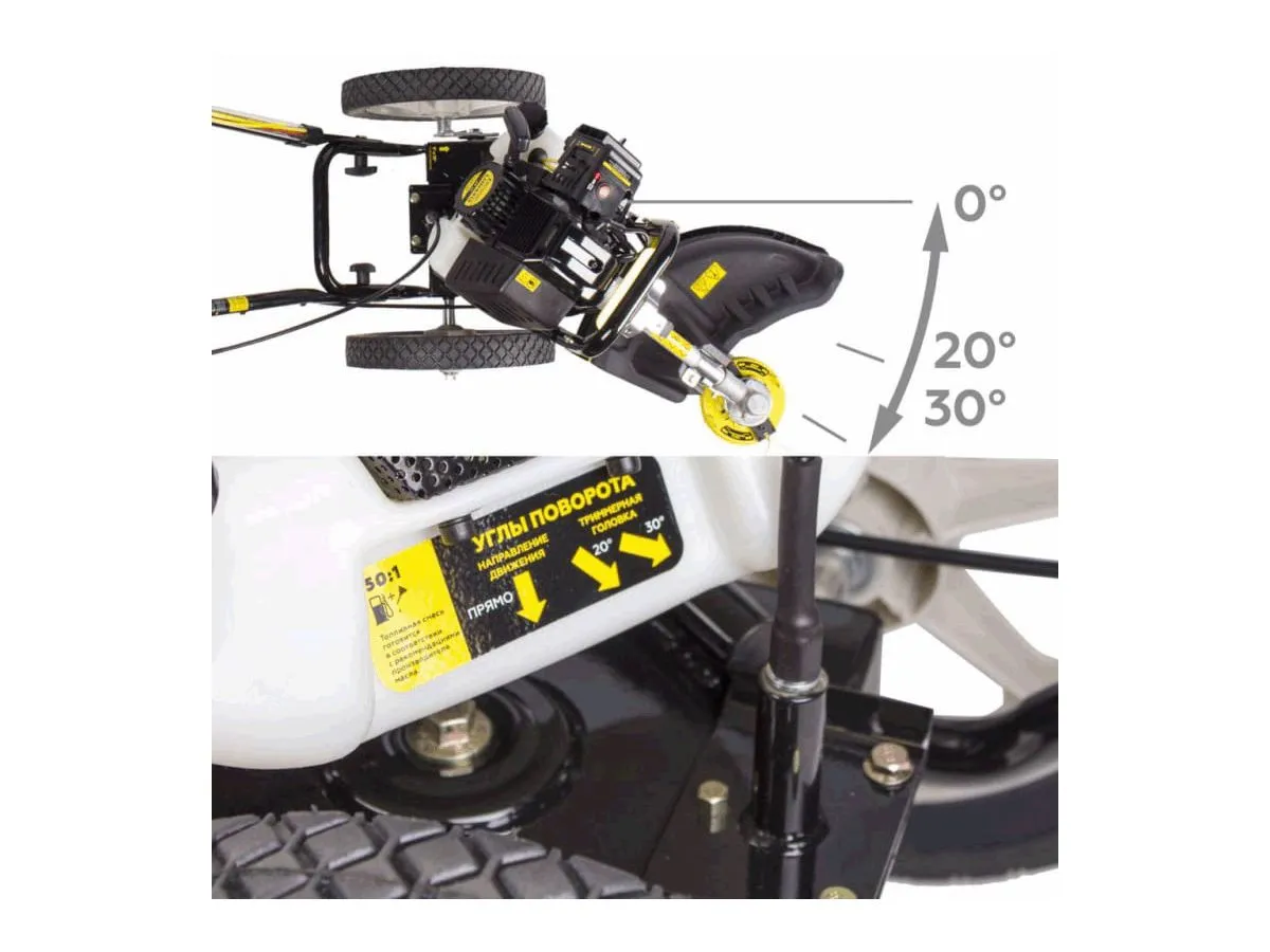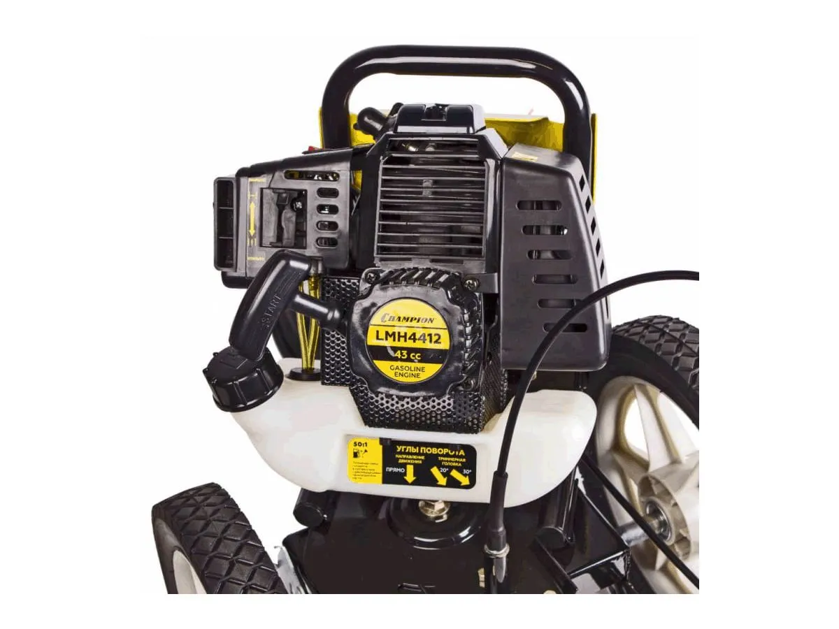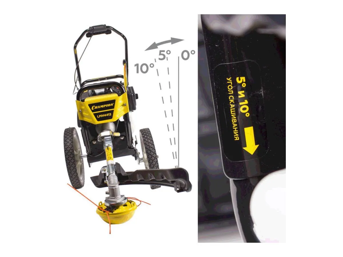 Газонокосилка Champion LMH4412 оснащена двухтактным двигателем. Имеет большие колеса и укороченный вал. Редуктор передает крутящий момент триммерной головке. Для работы в труднодоступных местах предусмотрен поворот штанги триммерной головки вправо (по ходу движения) на два положения - 20° и 30°. Агрегат может выкашивать заросли у кромки забора, в углублениях вокруг деревьев, длинные склоны. Укомплектован контейнером для хранения запасного корда. Возможно использование толстого корда диаметром до 4 мм.