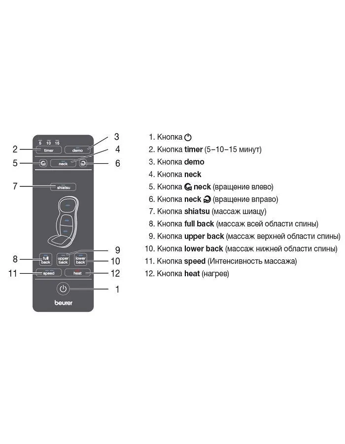 С помощью массажной накидки на кресло Beurer MG 254 вы сможете провести сеанс шиацу массажа, повысить мышечный тонус и снять усталость. Четыре массажные головки выполняют интенсивный массаж вдоль позвоночника, два массажных пальца предназначены для массажа шеи. Вы можете выбрать зону массажа и его интенсивность. Внимание! Имеются противопоказания. Перед применением рекомендуется проконсультироваться с врачом.